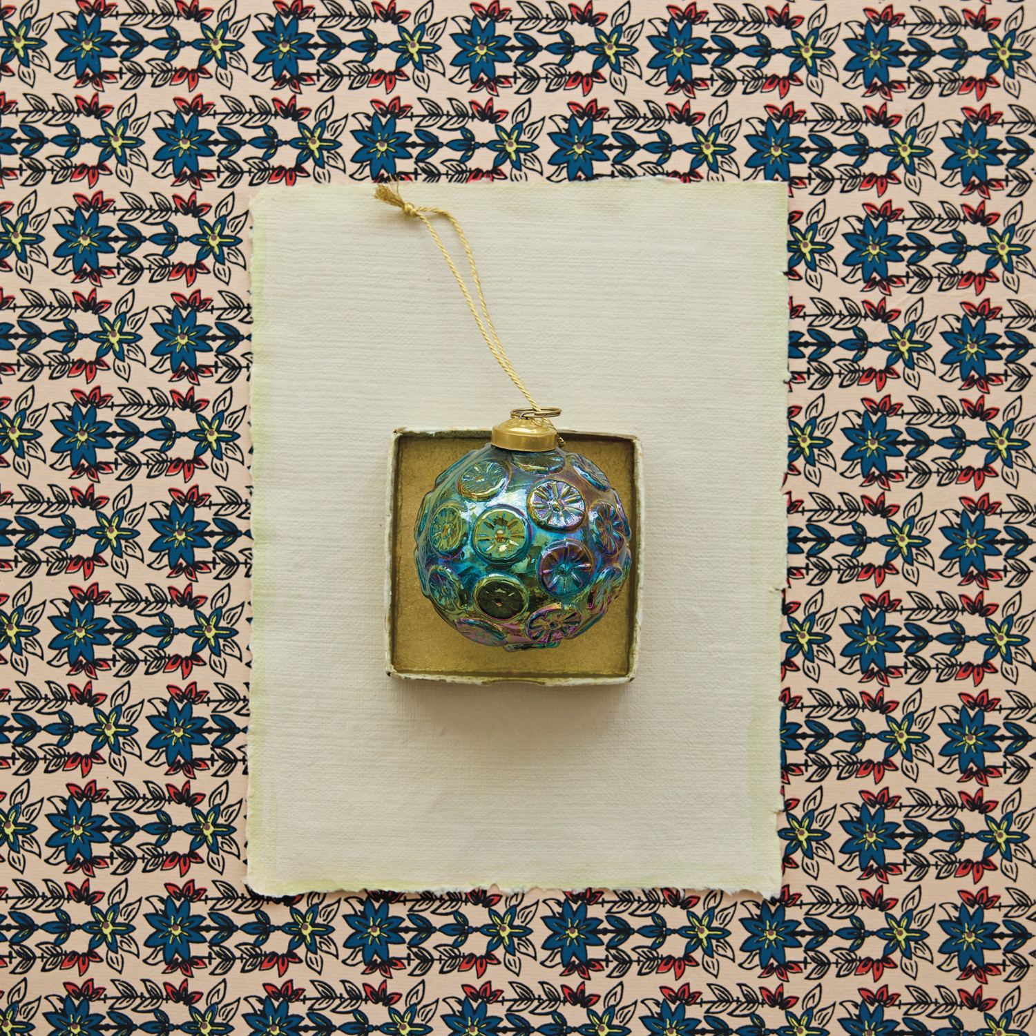 Hand-Blown Embossed Glass Ball Ornament with Pattern, Green