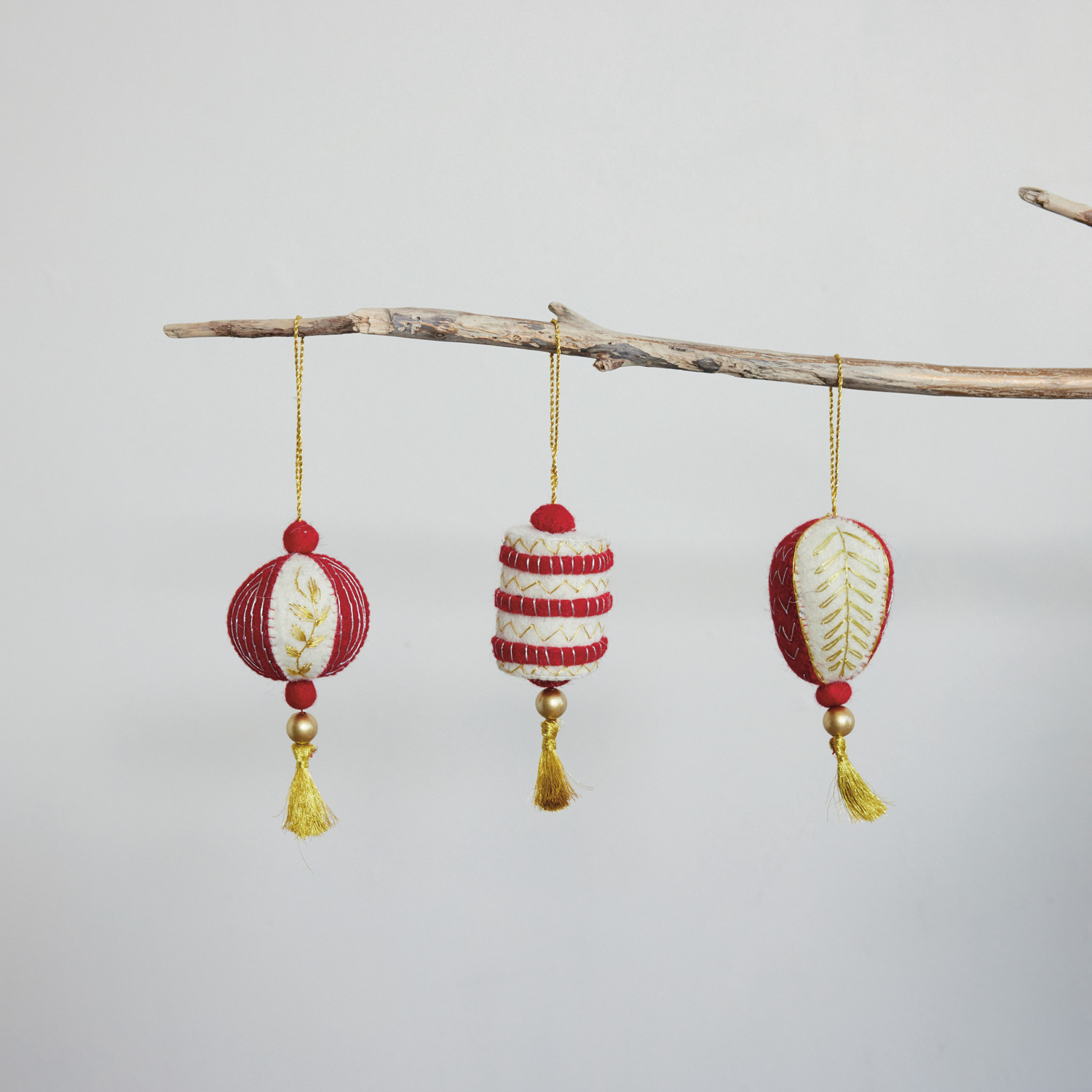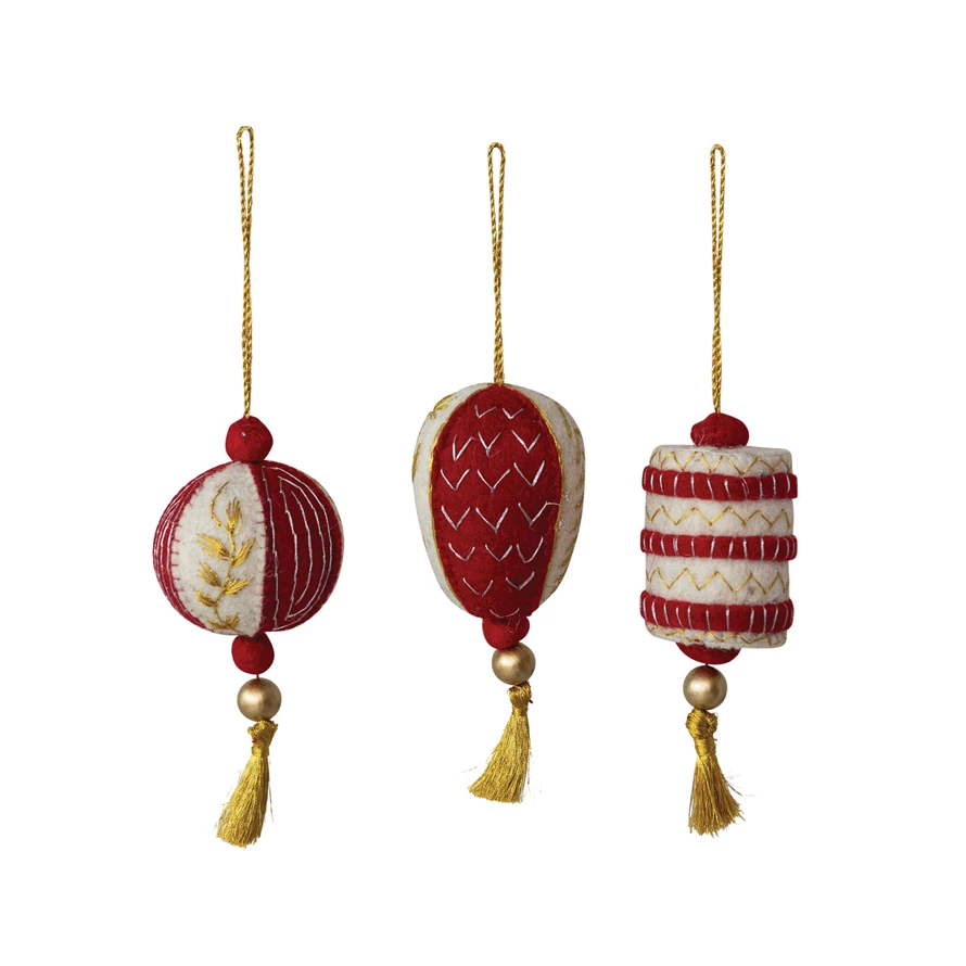 Catalog Name: 3-1/2"H - 4"H Handmade Wool Felt Ornament w/ Pom Poms, Tassel, Beads & Metallic Gold Thread Embroidery, Red & Cream Color, 3 Styles