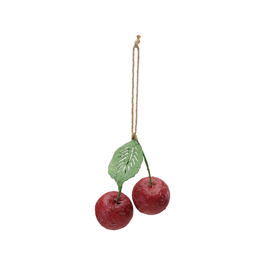 Catalog Name: 9"H Handmade Paper Mache Cherries Ornament, Red & Green