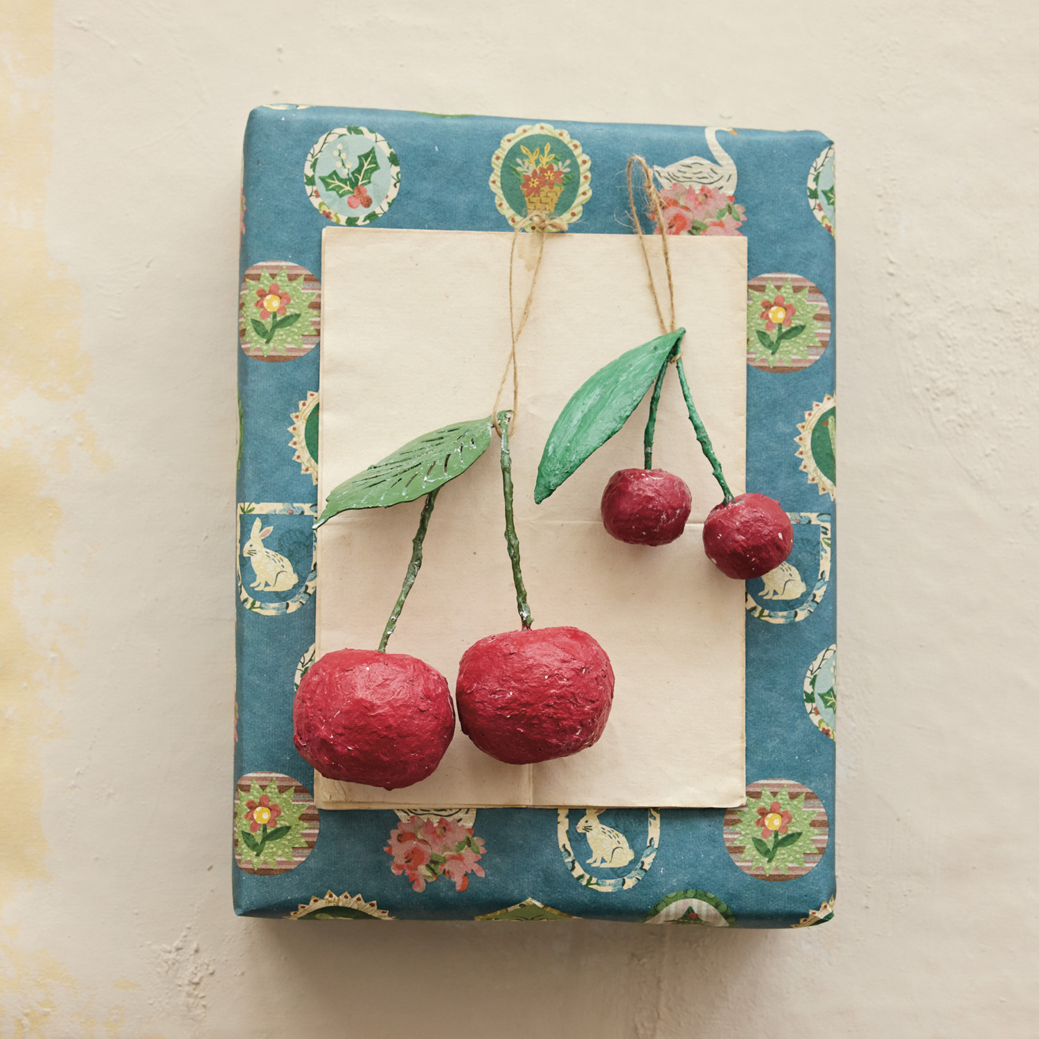 Handmade Paper Mache Cherries Ornament, Red & Green