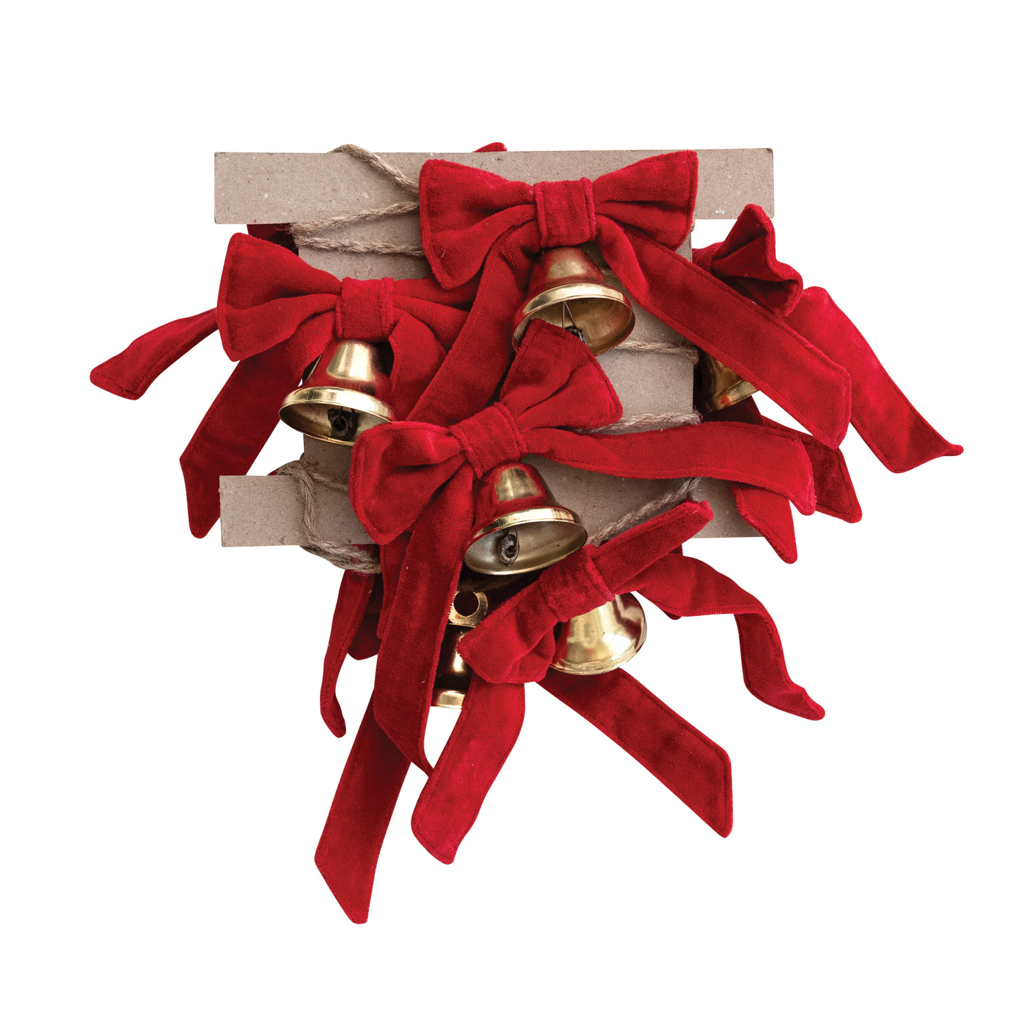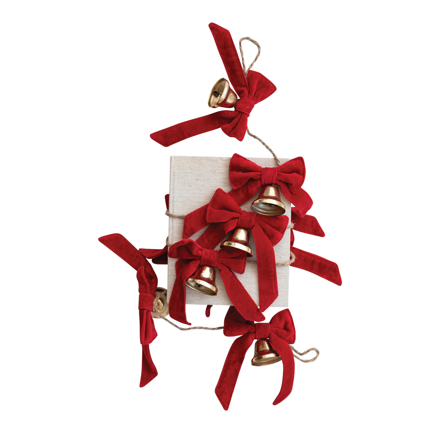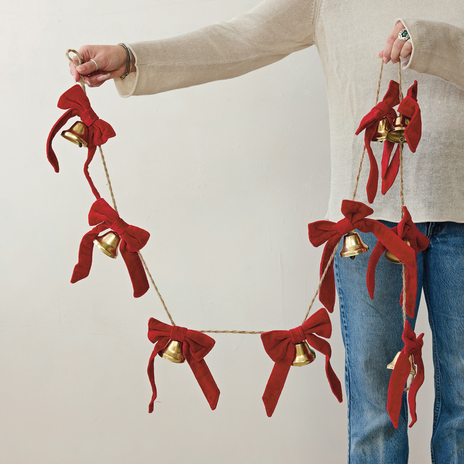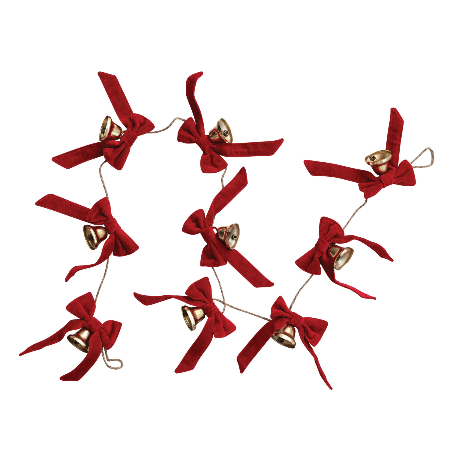 Metal Bell Garland with Cotton Velvet Bows, Gold Finish & Red