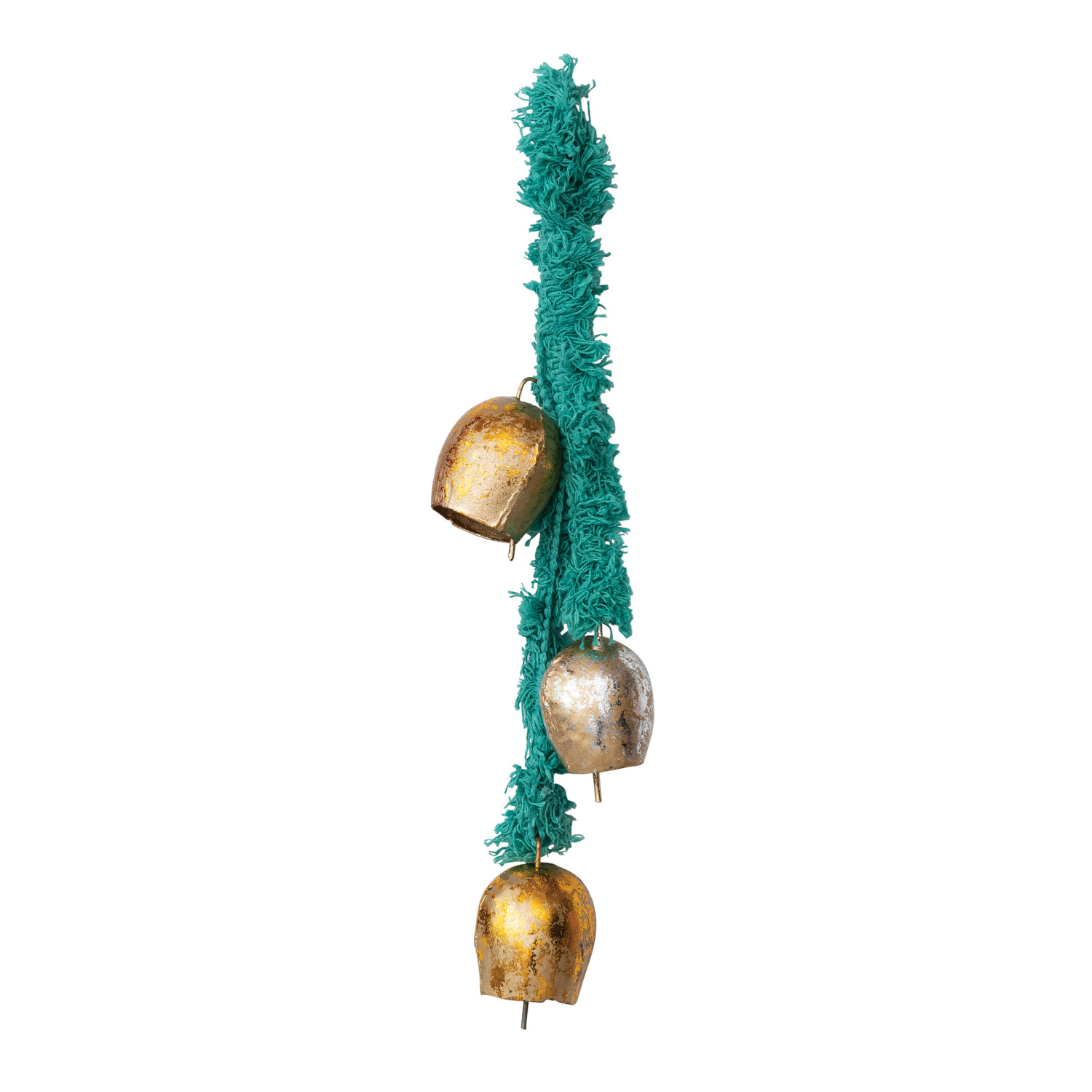 Handmade Hanging Metal Bells with Frayed Cotton Hanger, Gold Finish & Turquoise Color