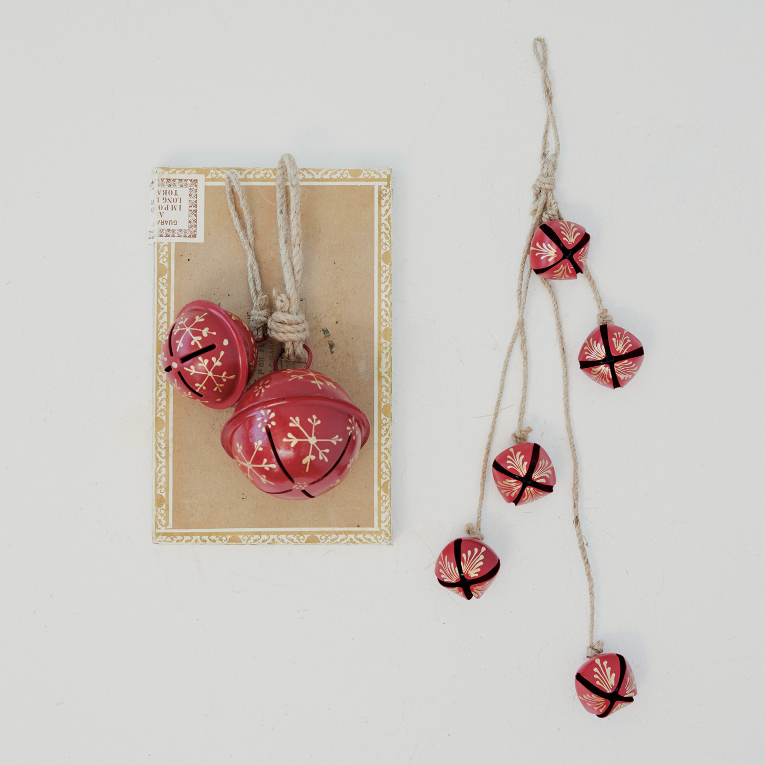 Hand-Painted Metal Jingle Bell Ornament with Snowflakes & Jute Hanger, Red & Gold Finish