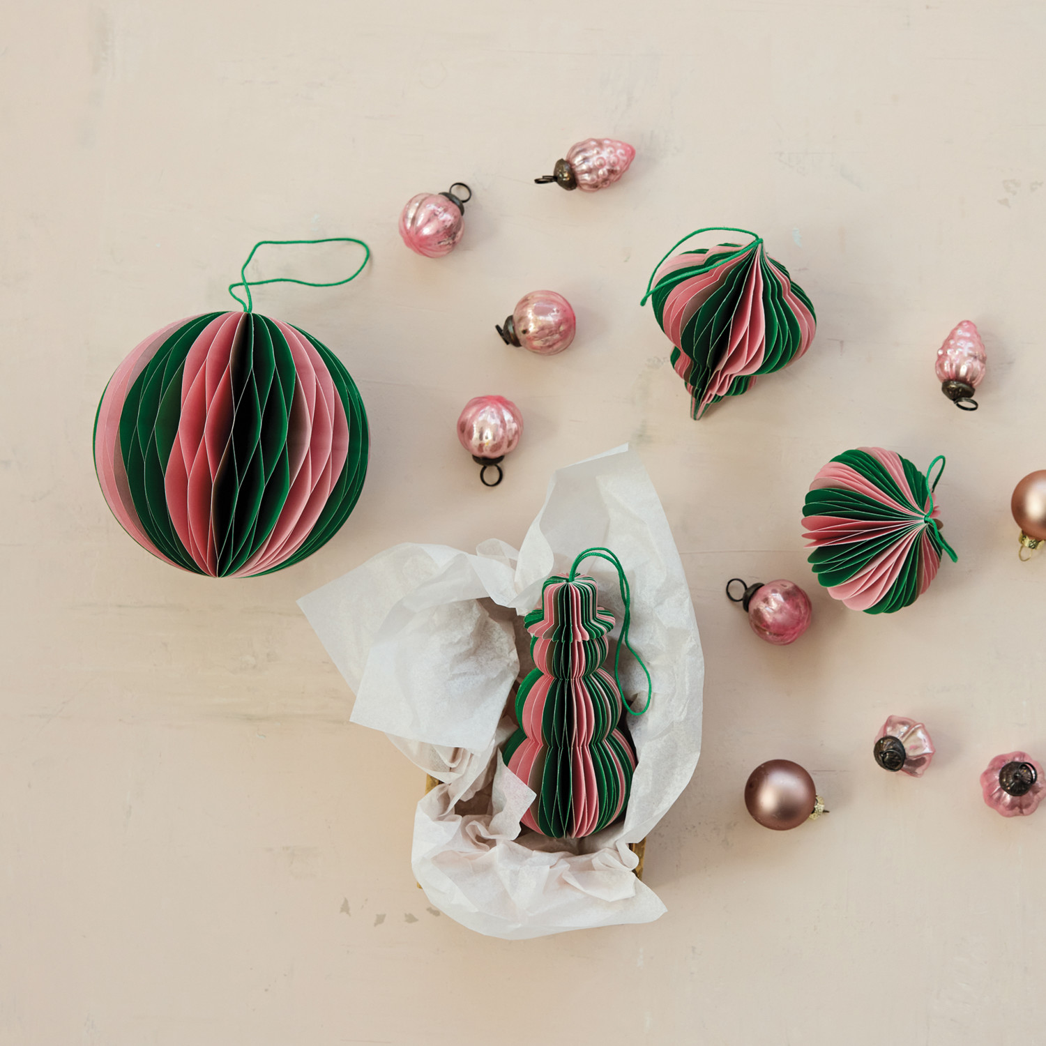 Handmade Recycled Paper Folding Honeycomb Ball Ornament, Green & Pink