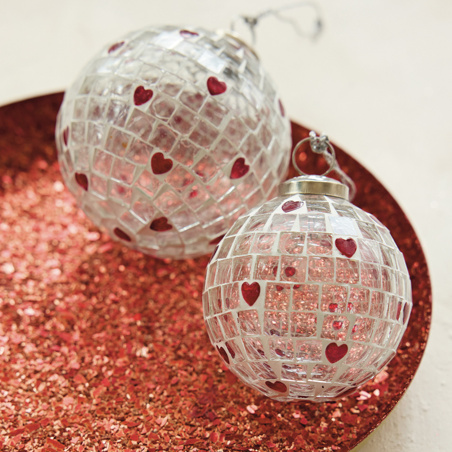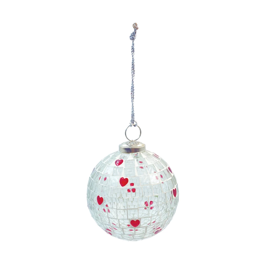 Glass Mosaic Ball Ornament with Hearts, Red & White