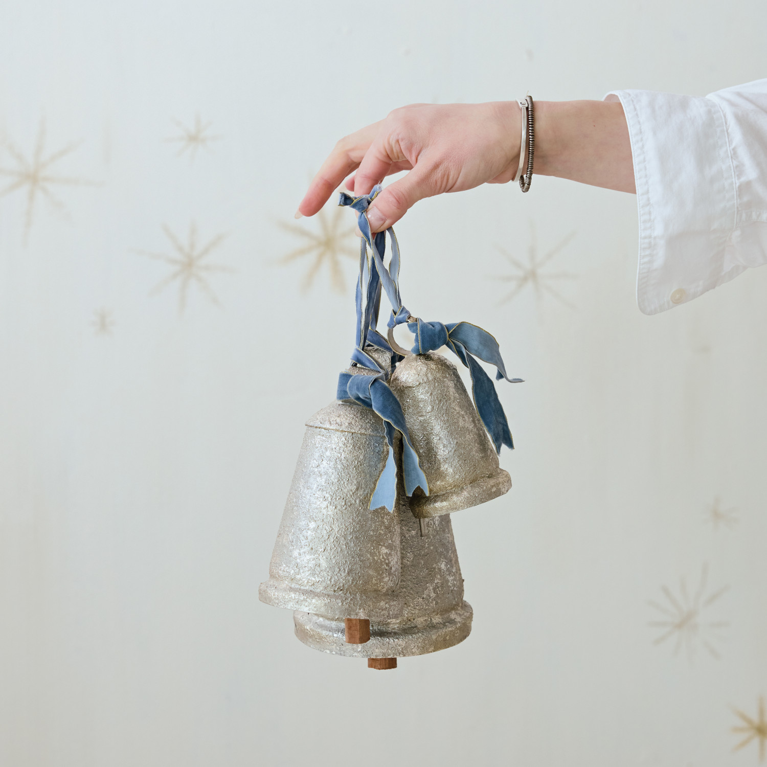Metal & Wood Bell with Blue Velvet Ribbon, Antique Silver Finish