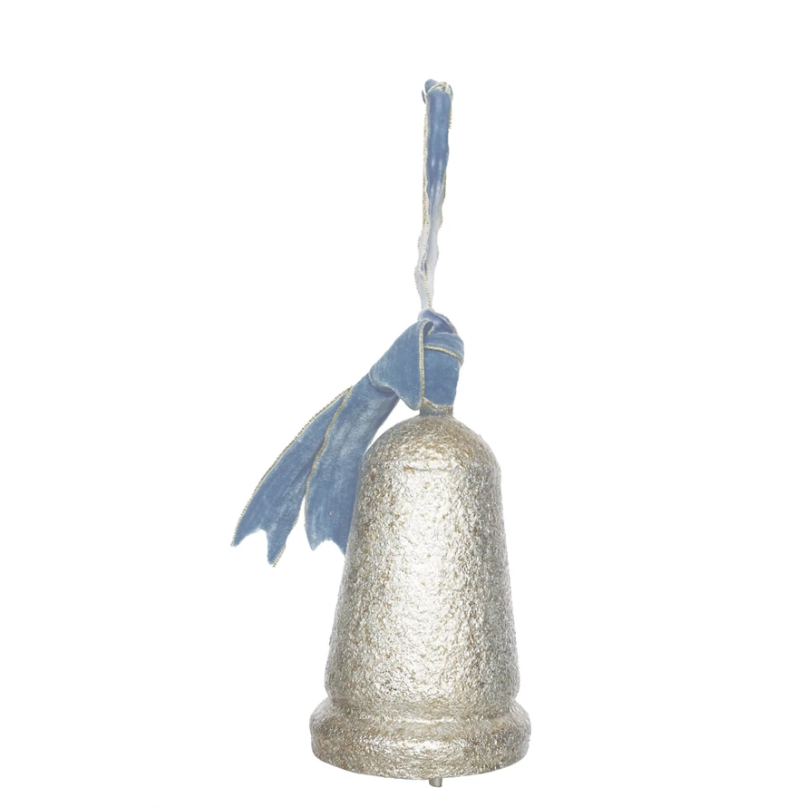 Catalog Name: 6-1/2"H Metal & Wood Bell w/ Blue Velvet Ribbon, Antique Silver Finish