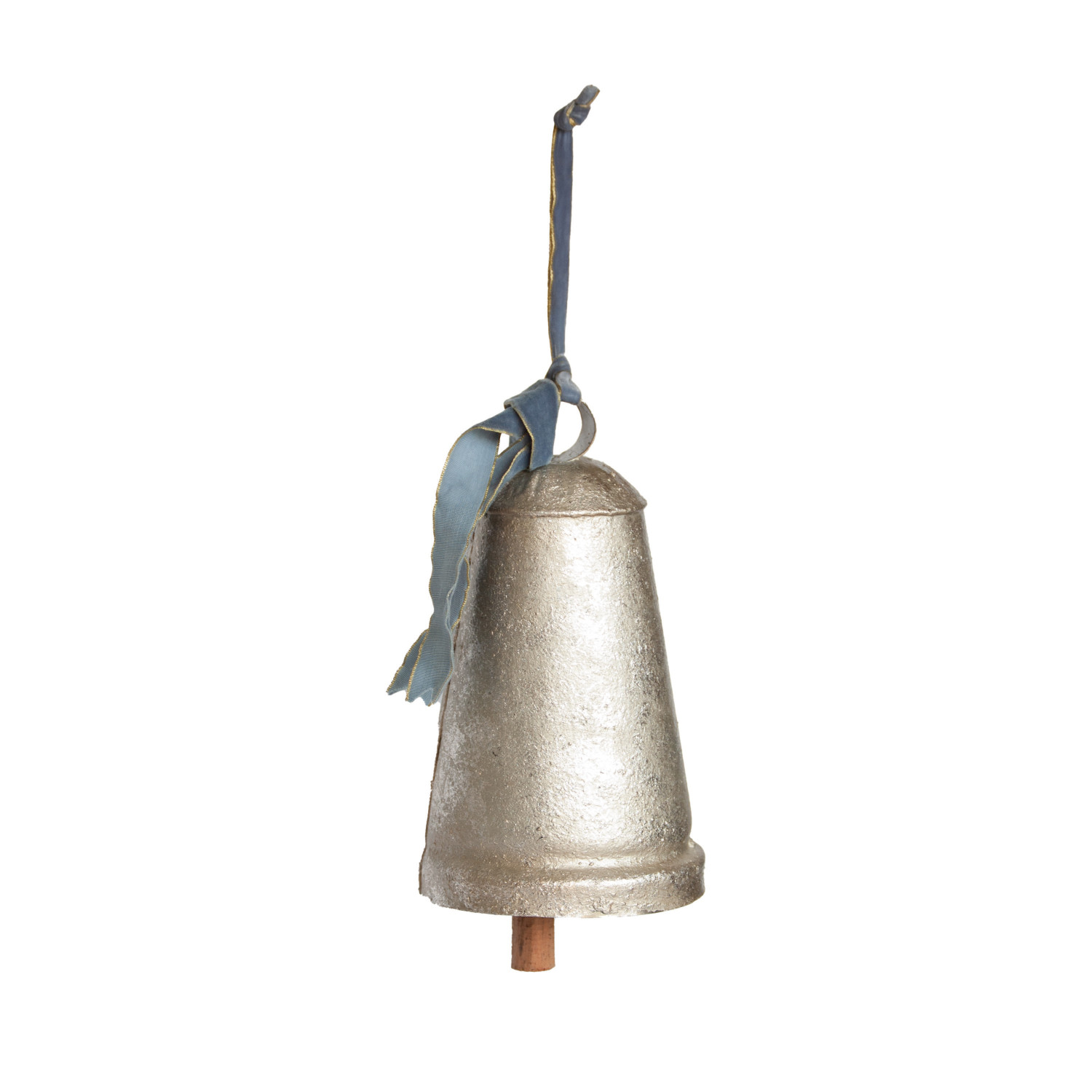 Catalog Name: 8"H Metal & Wood Bell w/ Blue Velvet Ribbon, Antique Silver Finish
