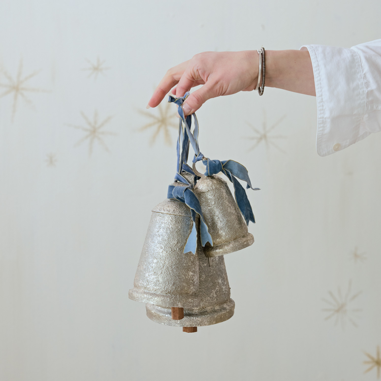 Metal & Wood Bell with Blue Velvet Ribbon, Antique Silver Finish