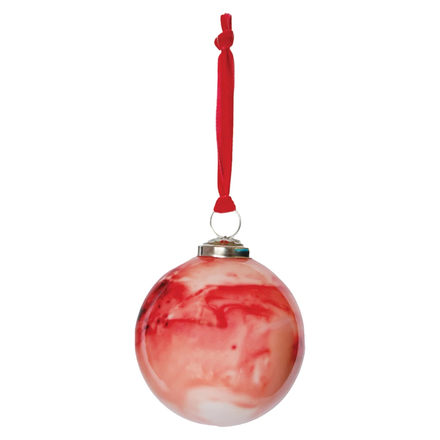 Glass Ball Ornament with Velvet Ribbon, Marbled Pink & Red