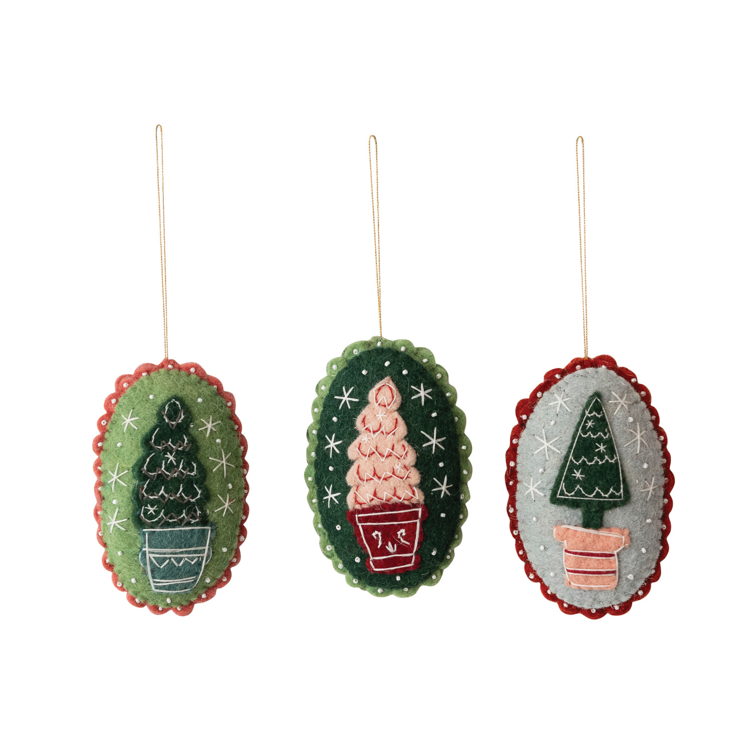 Catalog Name: 5"H Oval Handmade Wool Felt Ornament w/ Tree, Embroidery, Beads & Scalloped Trim, Multi Color, 3 Styles ©