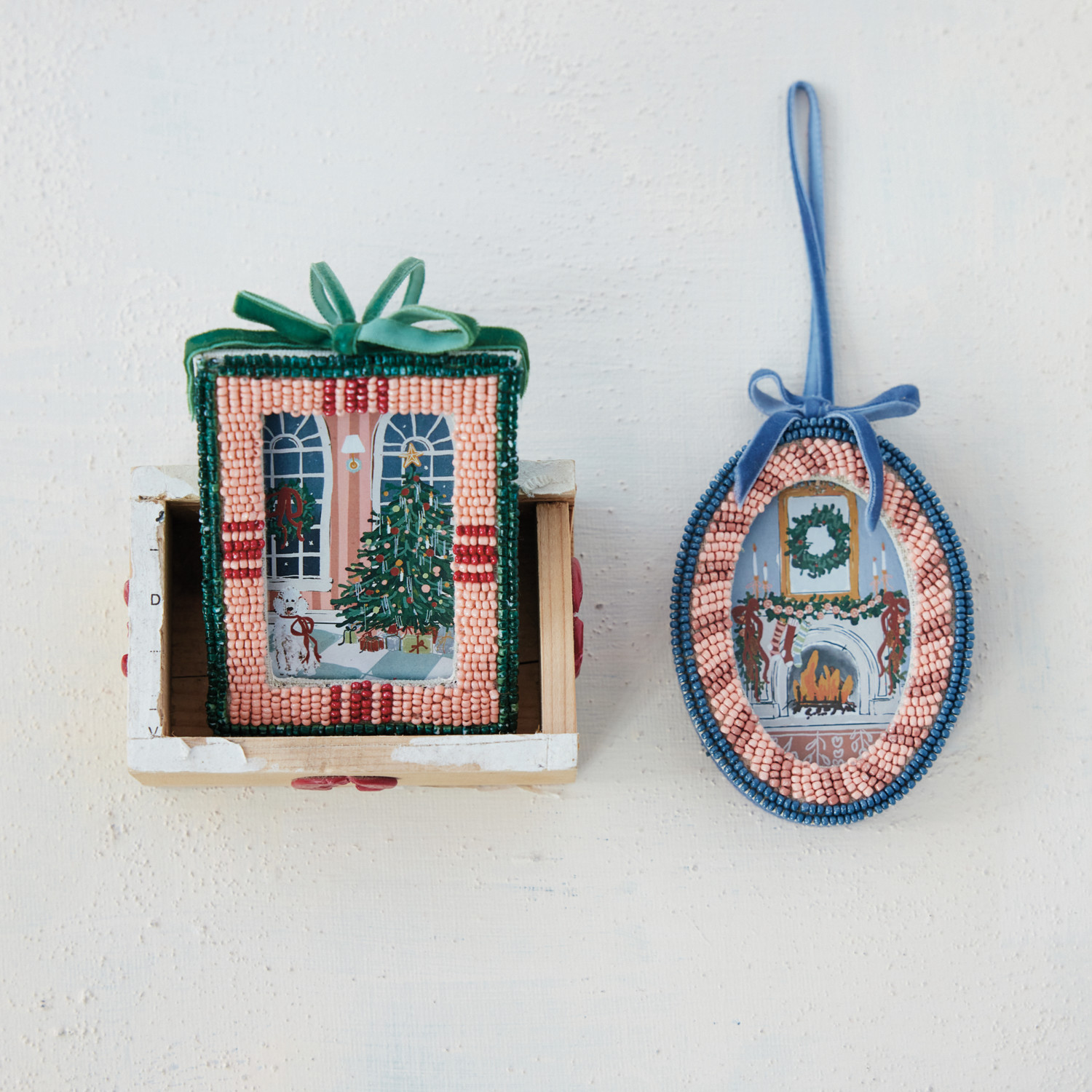 Glass Beaded Photo Frame Ornament with Velvet Bow & Hanger, 2 Styles ©