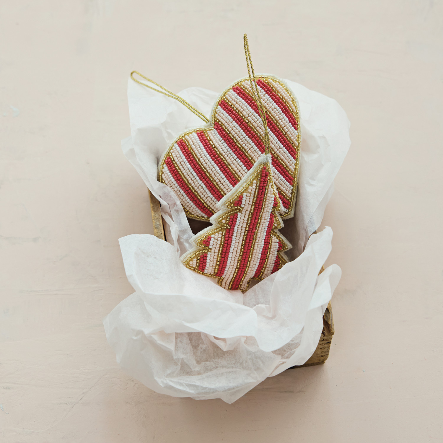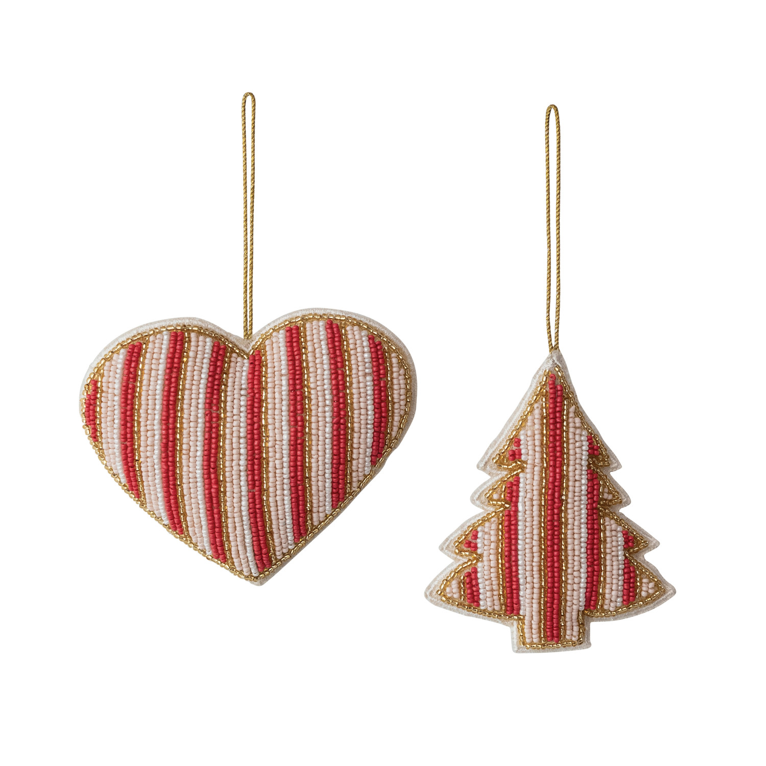 Handmade Cotton Beaded Striped Heart/Tree Ornament, Pink, Gold Finish & White, 2 Styles