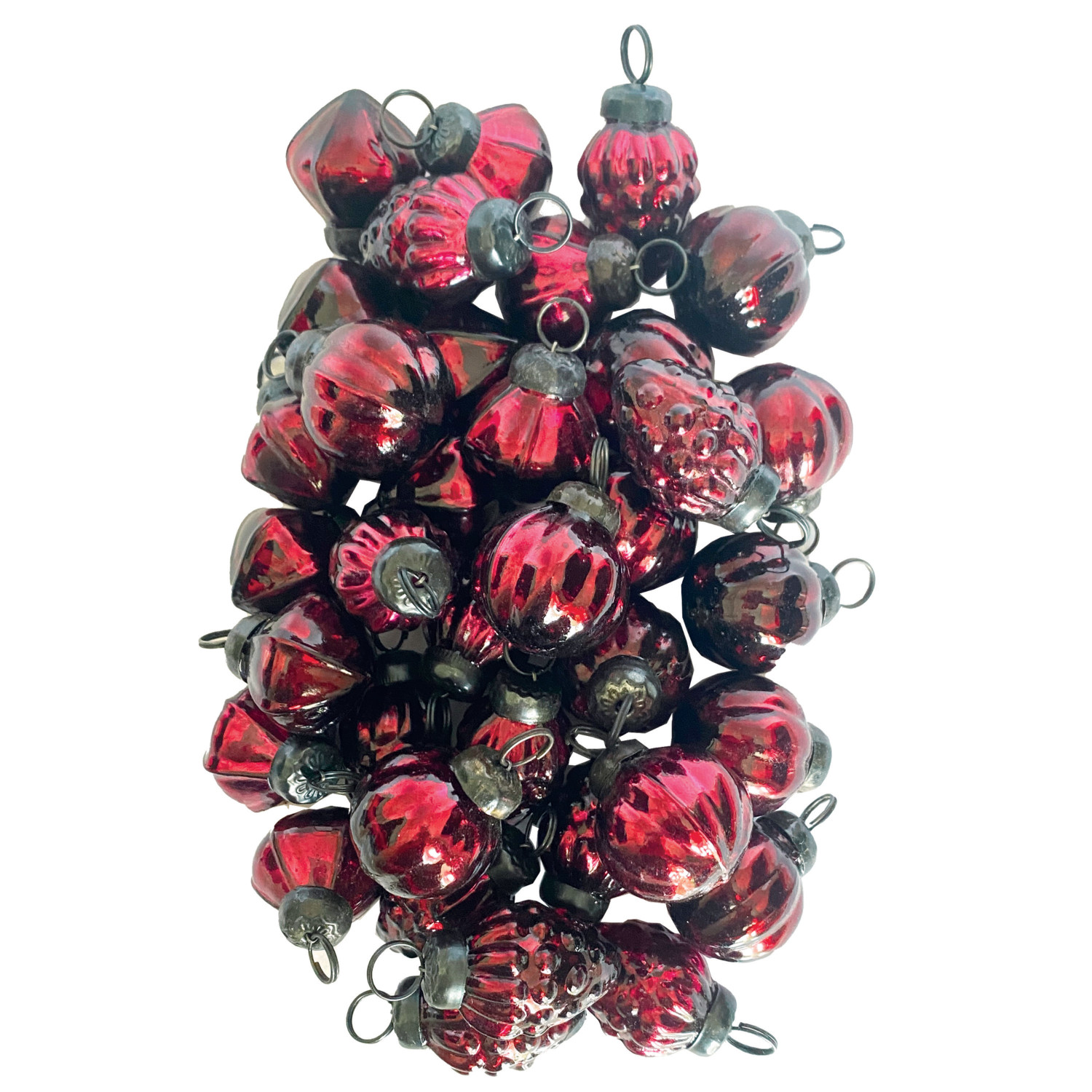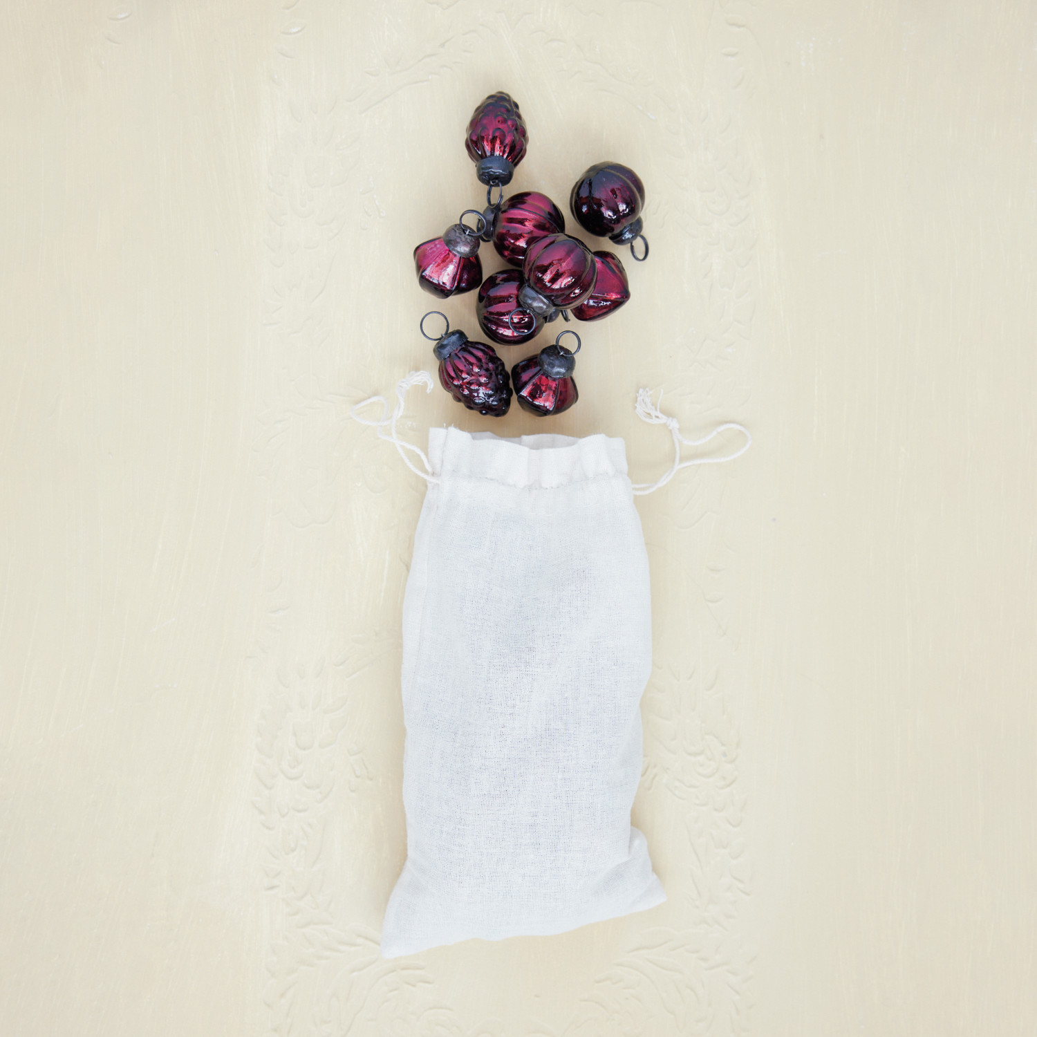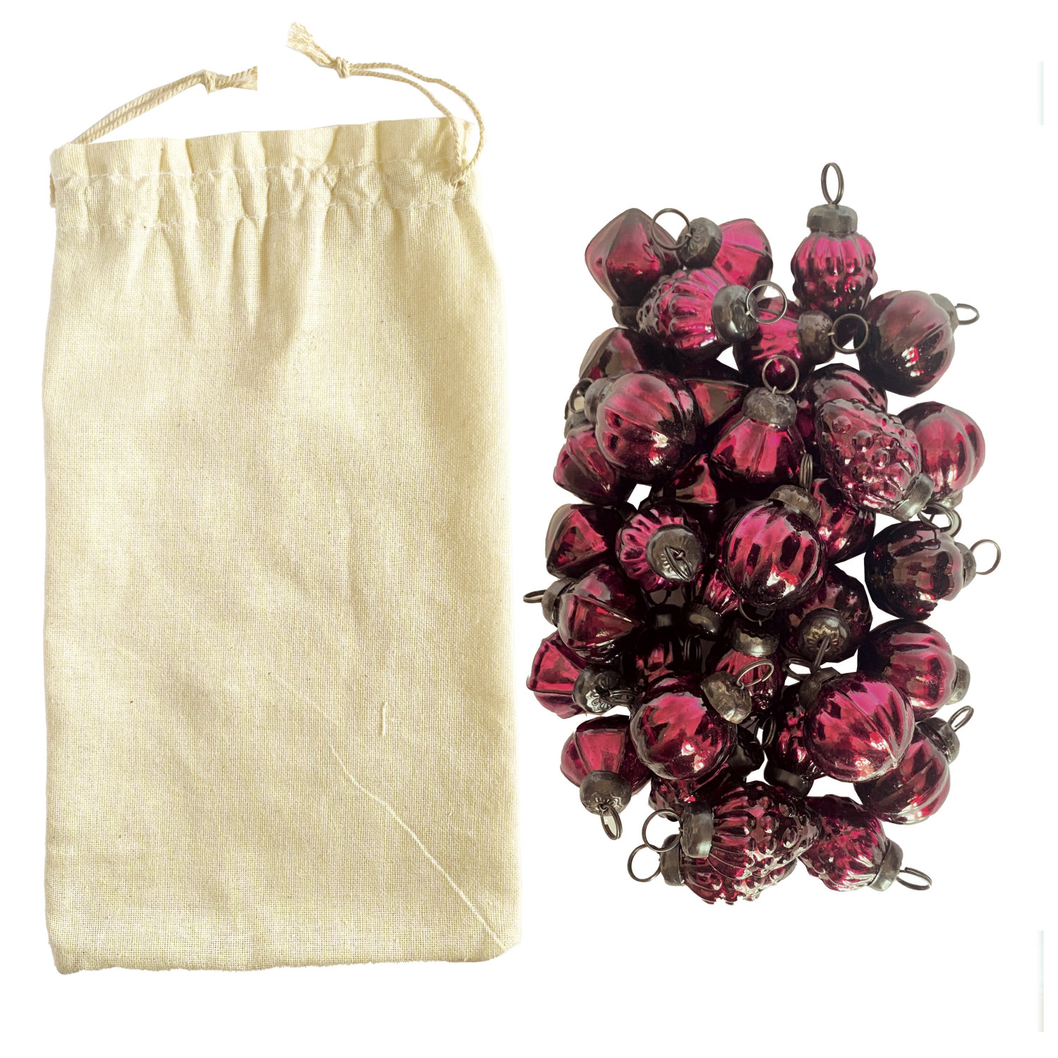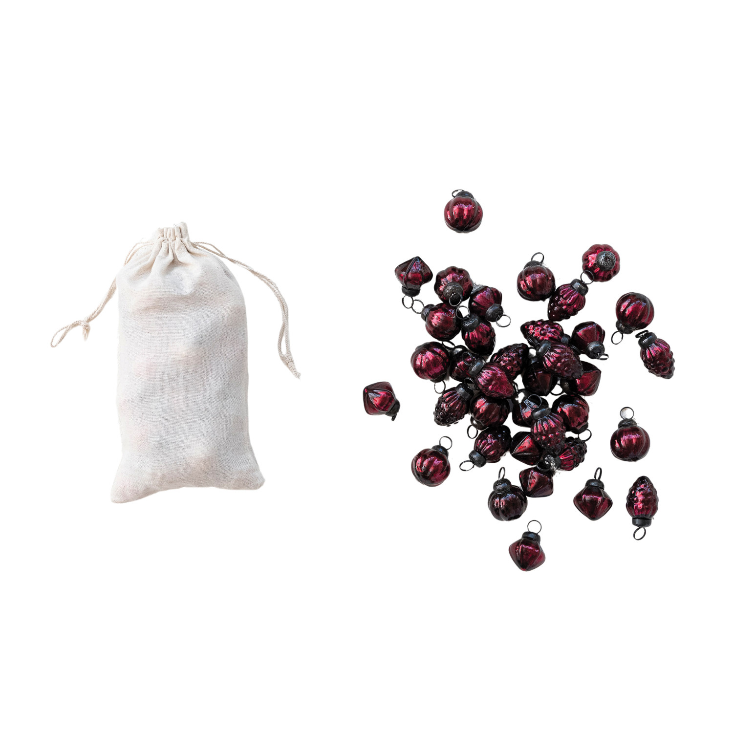 Embossed Mercury Glass Ornaments in Muslin Bag, Burgundy, Set of 36