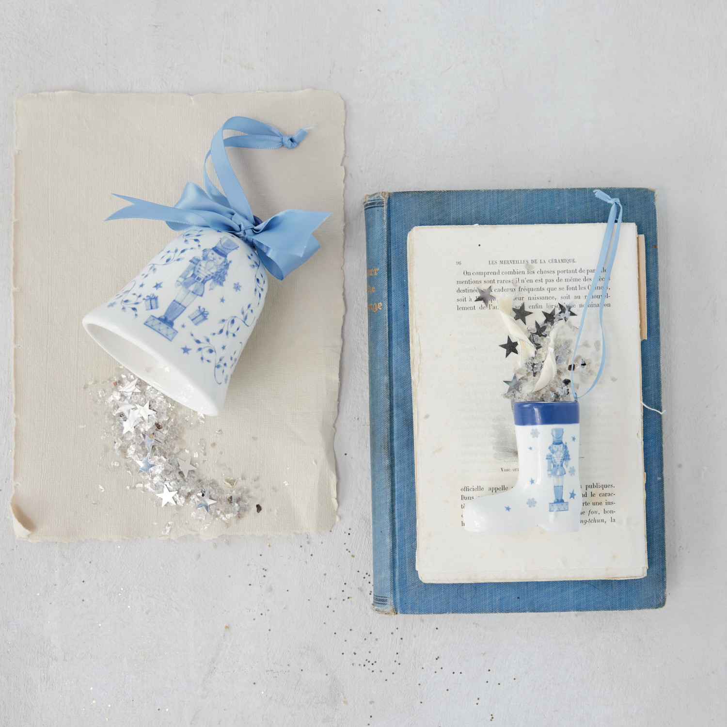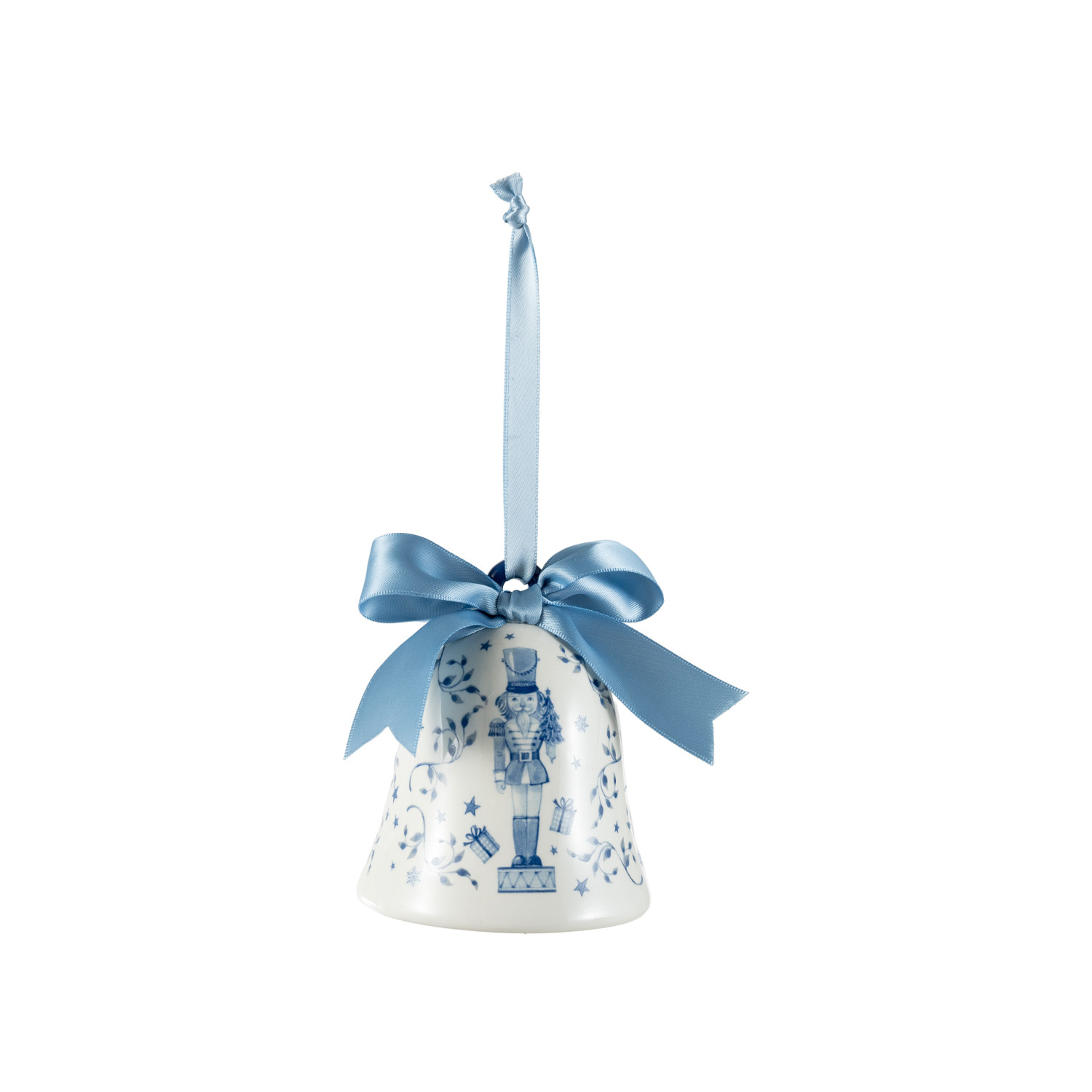 Catalog Name: 4-1/4"H Ceramic Bell Ornament w/ Nutcracker & Bow, White & Blue