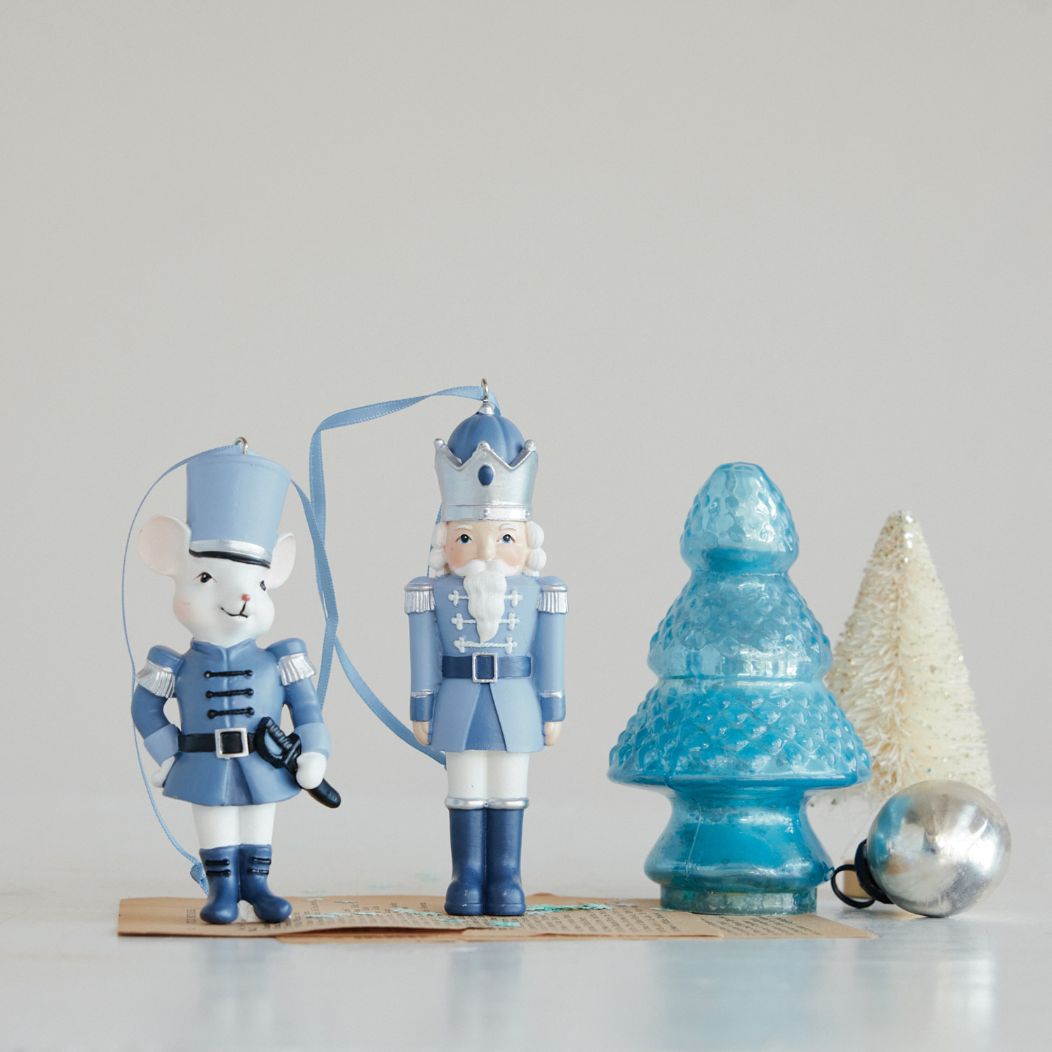 Catalog Name: 4"H - 4-3/4"H Resin Soldier Ornament, Blue, White & Silver Finish, 2 Styles