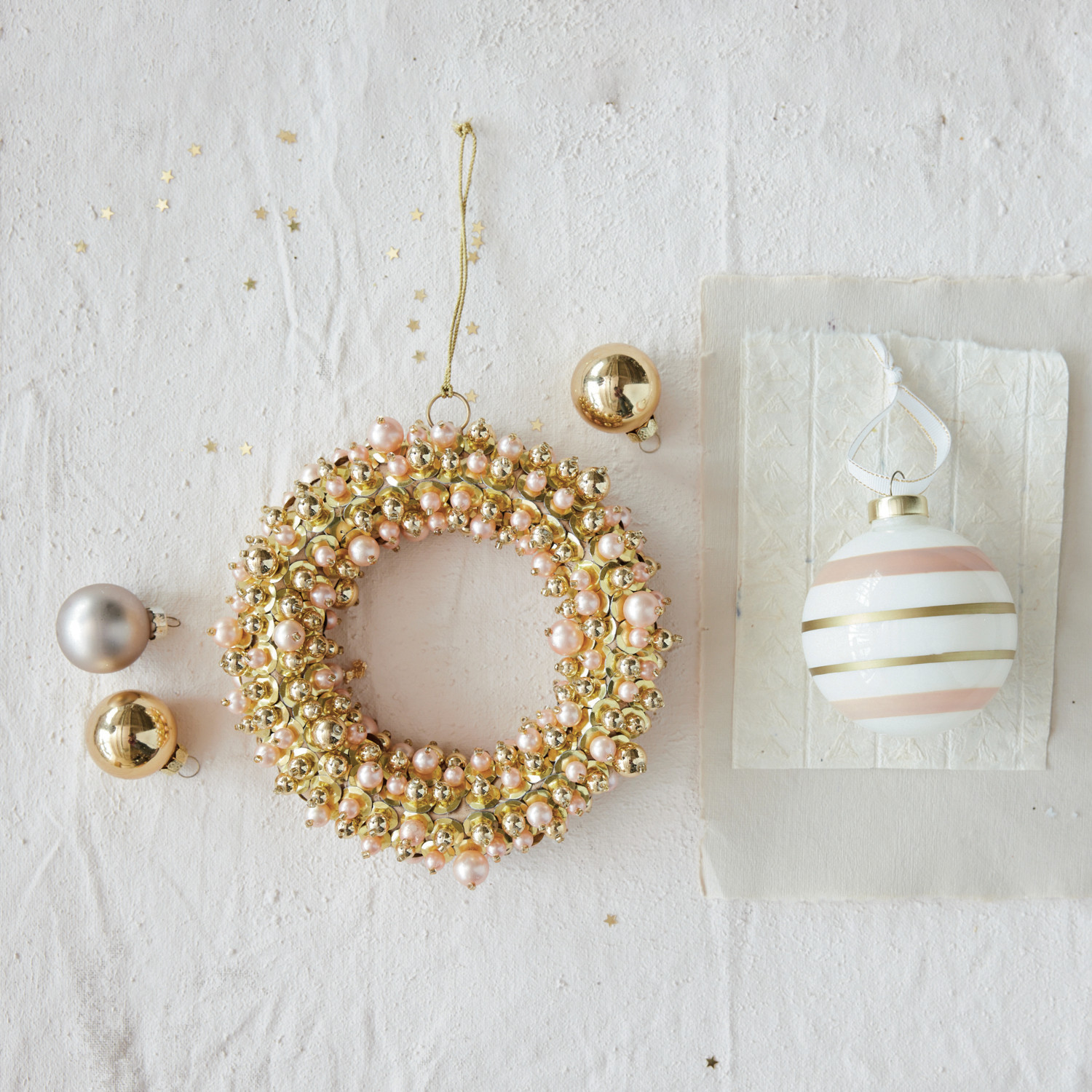 Faux Pearl & Glass Beaded Wreath Ornament with Sequins, Gold Finish & Pink