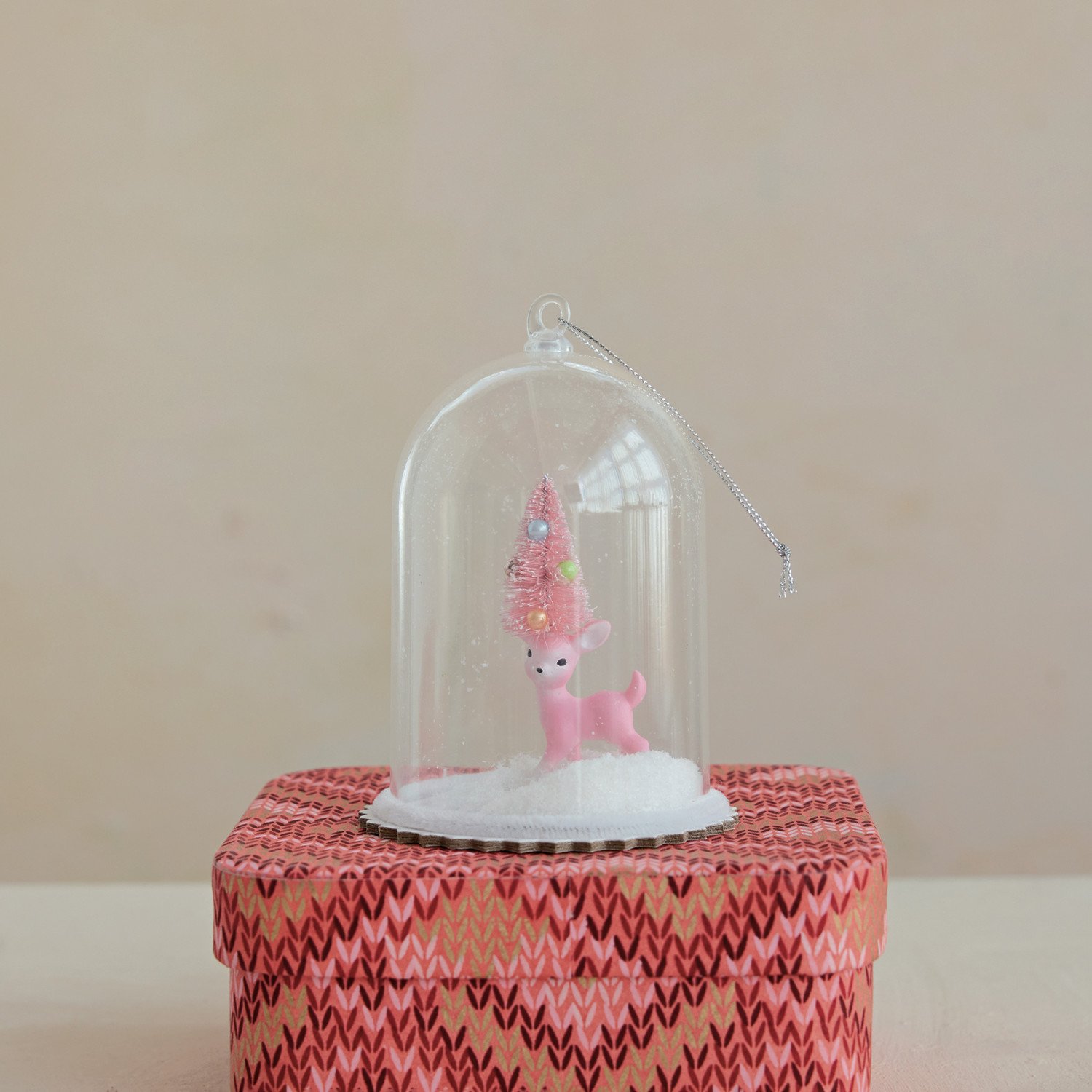 Plastic Cloche Ornament with Deer, Sisal Bottle Brush Tree & Glitter, Pink & White