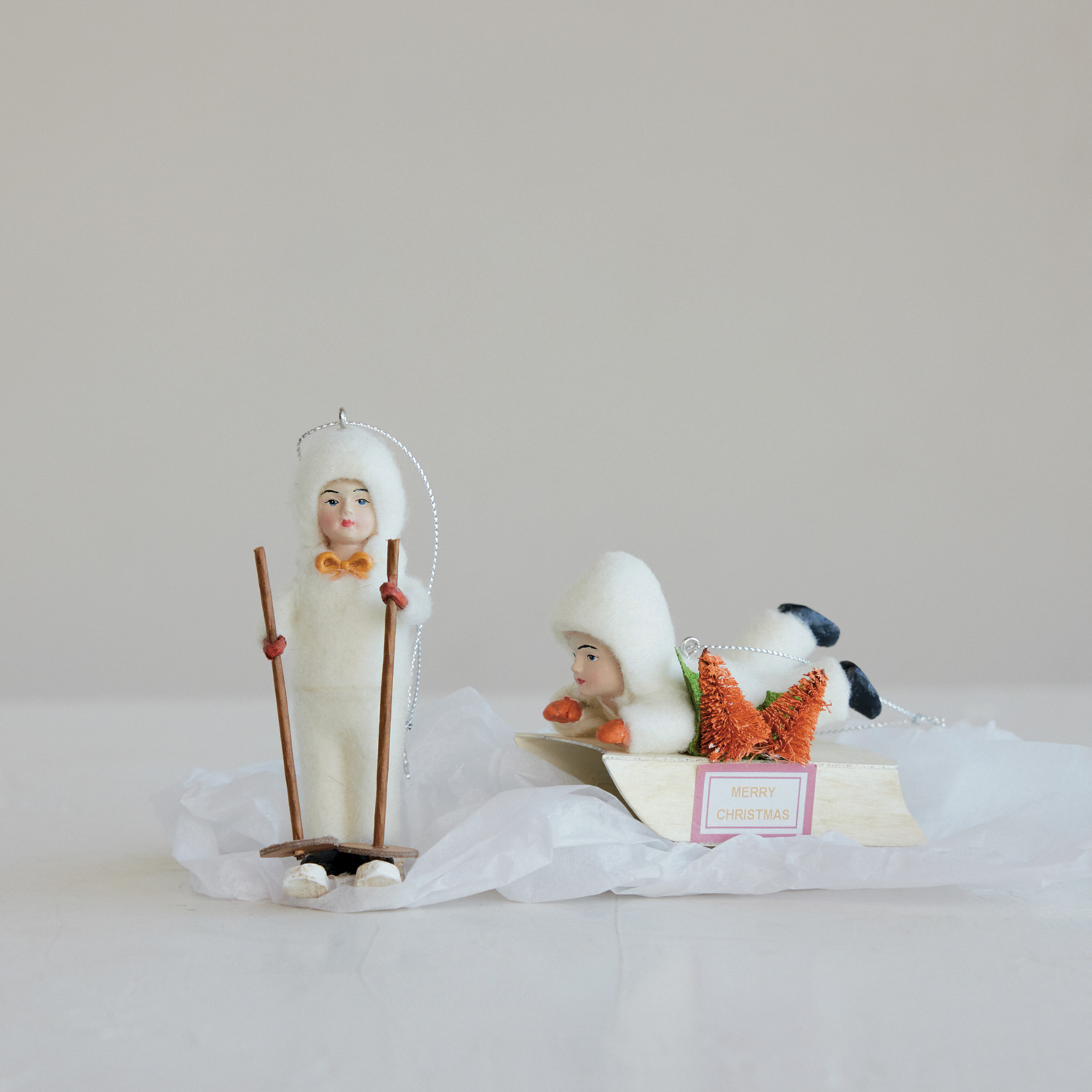 Catalog Name: 3-1/2"L x 2-1/2"H Resin Child on Sled w/ Bottle Brush Trees "Merry Christmas", Multi Color