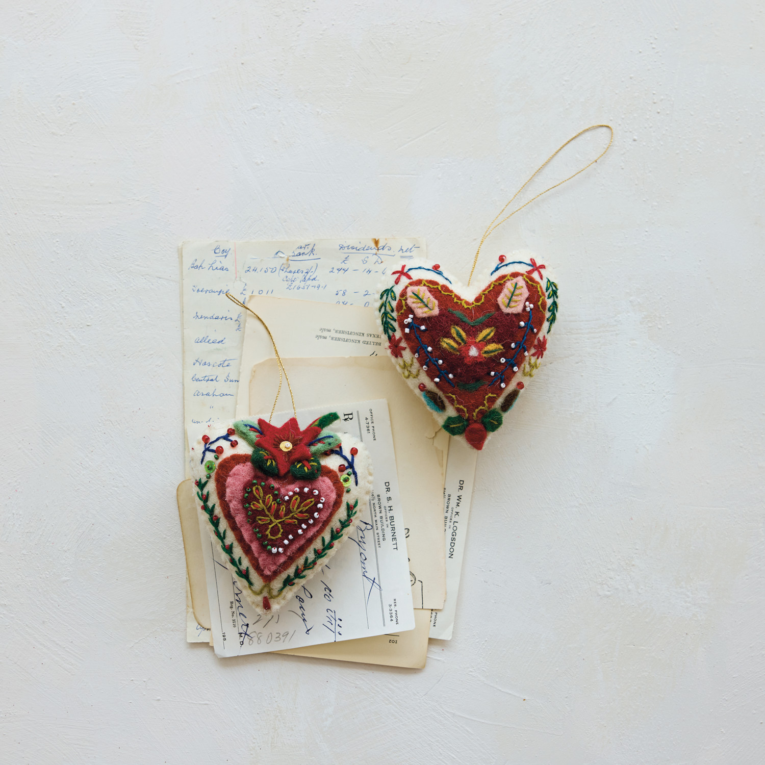 Handmade Wool Felt Heart Ornament with Embroidery & Beads, 2 Styles ©