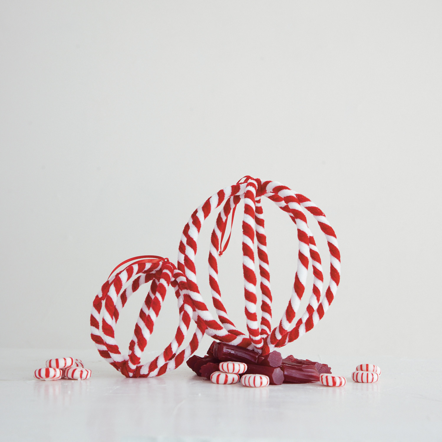 Wire Fabric Wrapped Striped Ball Ornament, Red & White