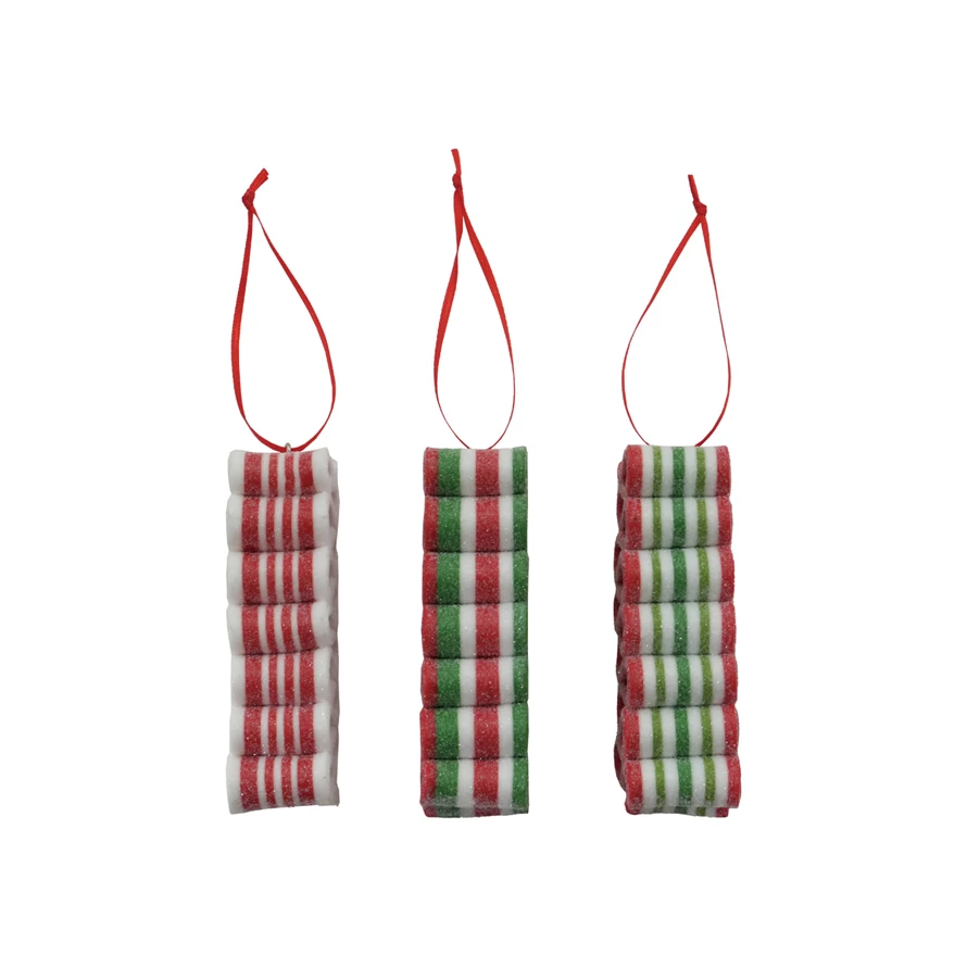 Catalog Name: 4"L Clay Striped Ribbon Candy Ornament w/ Glitter, Multi Color, 3 Styles