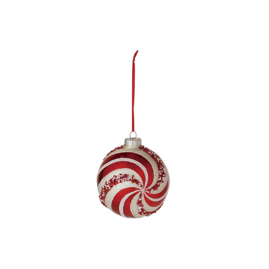 Catalog Name: 4" Round Glass Candy Striped Ball Ornament w/ Beads, Red & White
