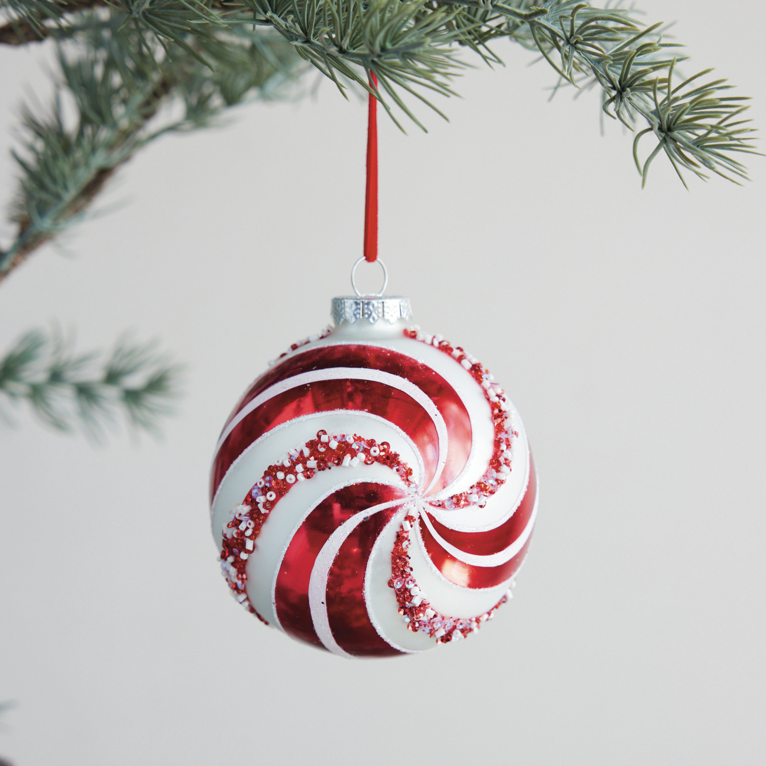Glass Candy Striped Ball Ornament with Beads, Red & White
