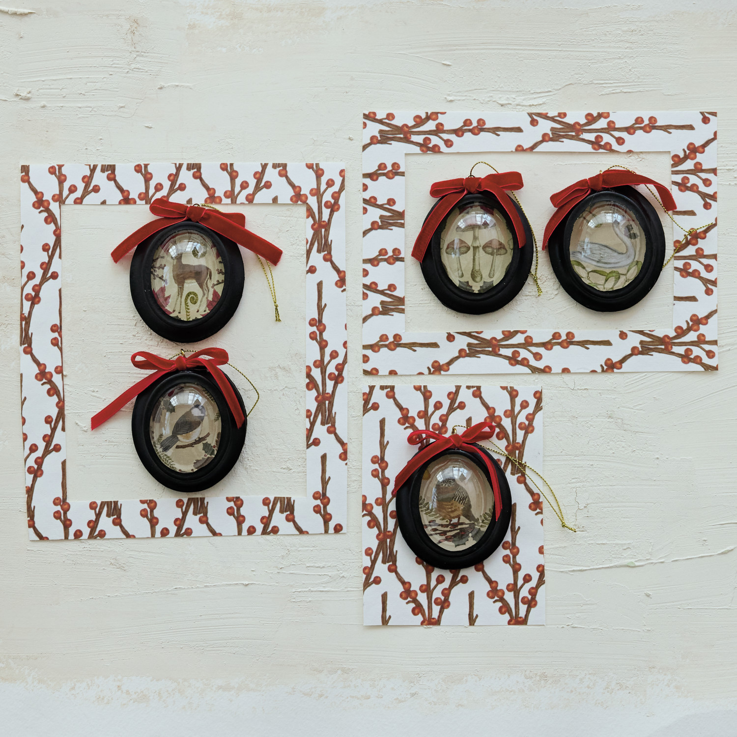 Convex Resin Framed Ornament with Seasonal Botanicals, Animal & Velvet Bow, 6 Styles ©