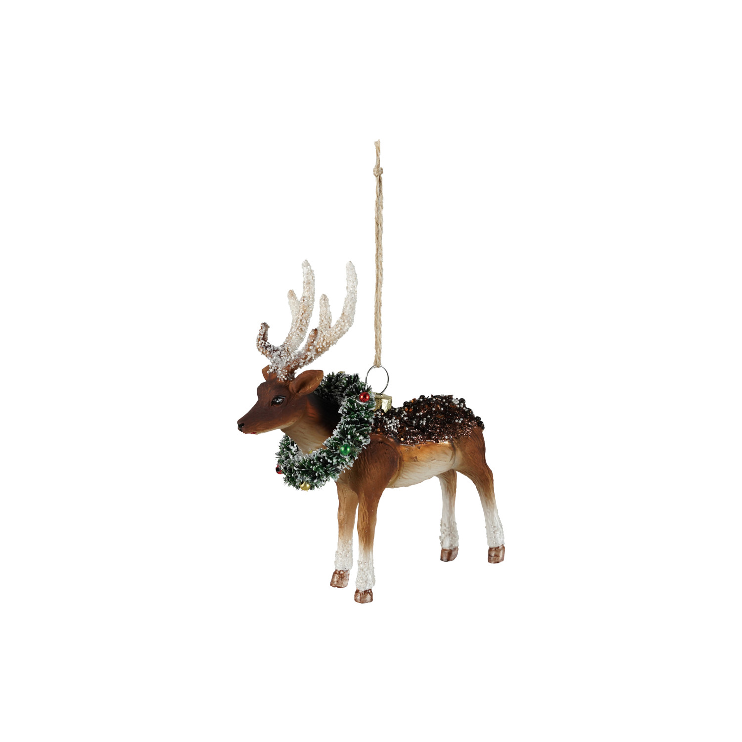 Catalog Name: 5-1/4"H Hand-Painted Glass Deer Ornament w/ Wreath, Sequins, Beads & Glitter, Multi Color ©