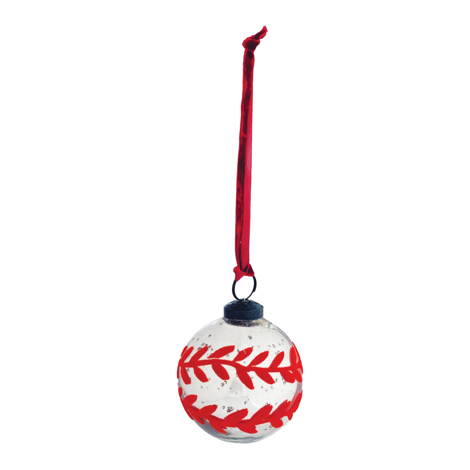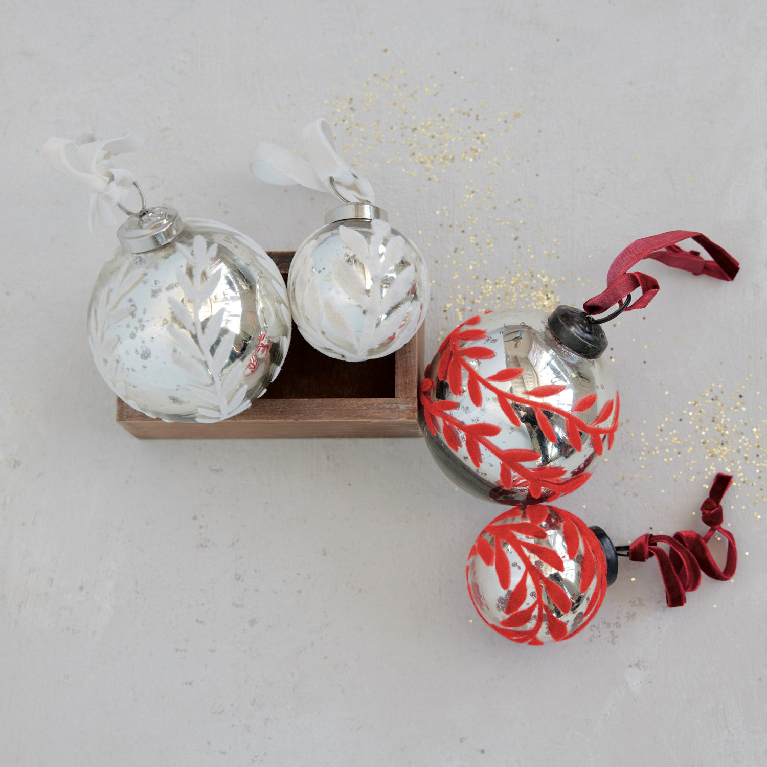 Catalog Name: 3" Round Mercury Glass Ball Ornament w/ Flocked Pattern & Velvet Ribbon Hanger, Silver Finish & Red