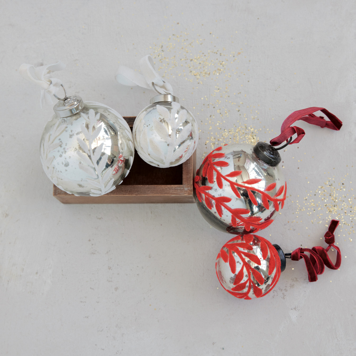 Catalog Name: 2" Round Mercury Glass Ball Ornament w/ Flocked Pattern & Velvet Ribbon Hanger, Silver Finish & Red