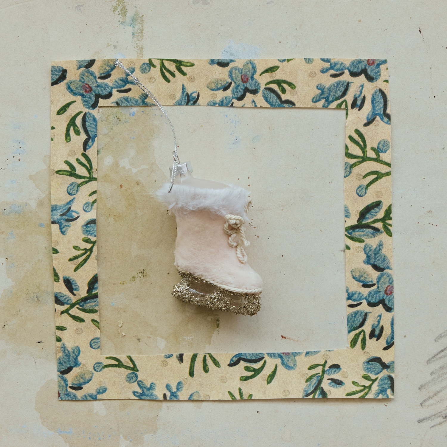 Glass & Faux Fur Ice Skate Ornament with Glitter, White, Pink & Gold Finish