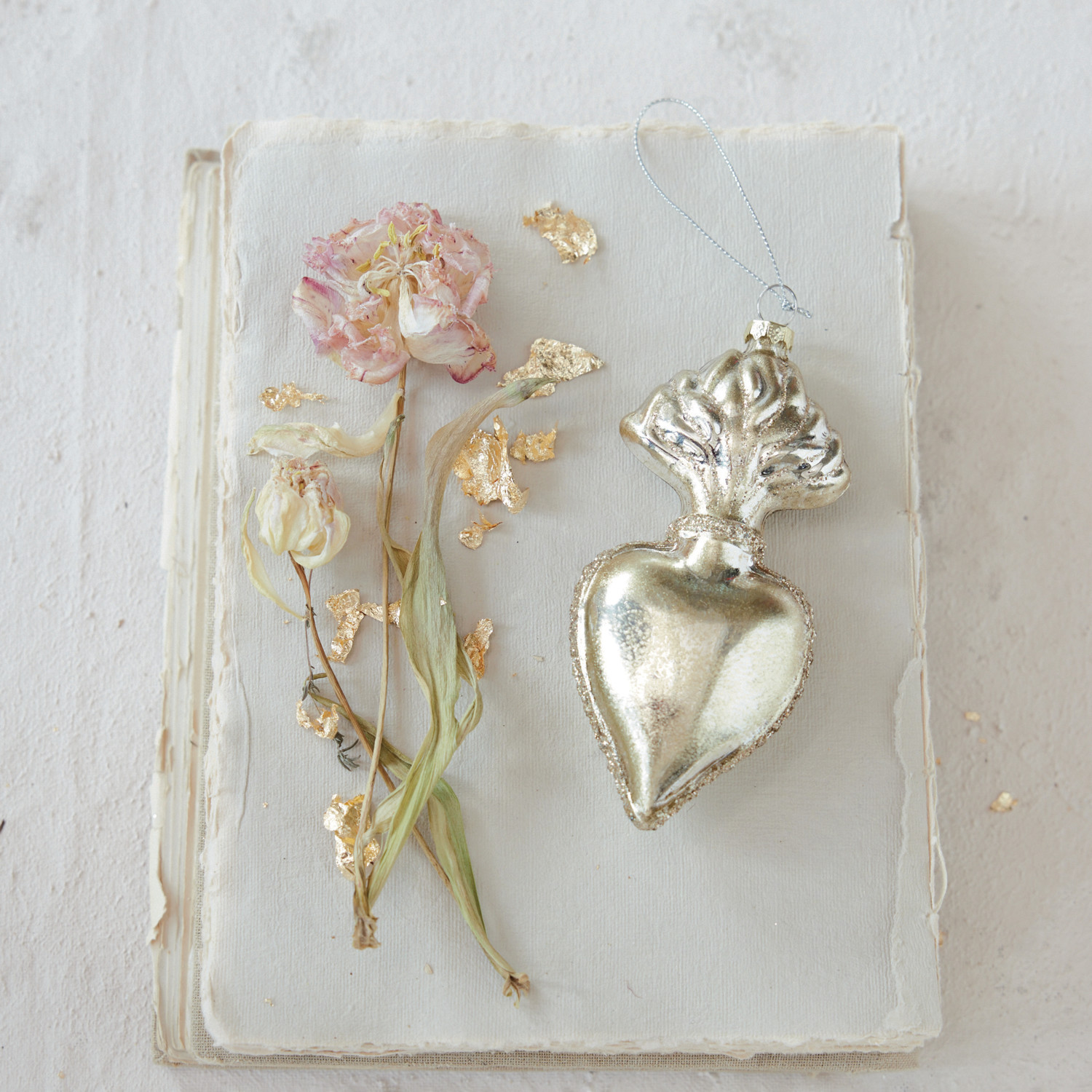 Glass Sacred Heart Ornament with Glitter, Gold Finish