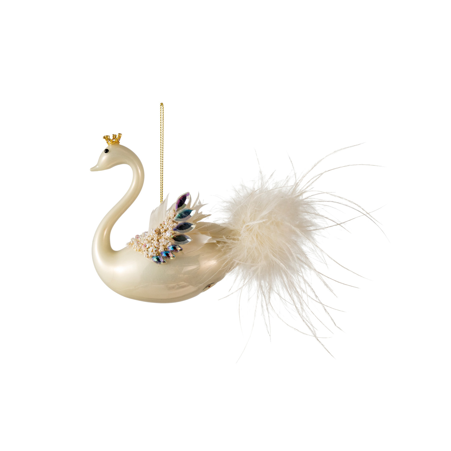 Hand-Painted Glass Swan Ornament with Faux Feathers, Iridescent Jewels, Beads & Crown, White