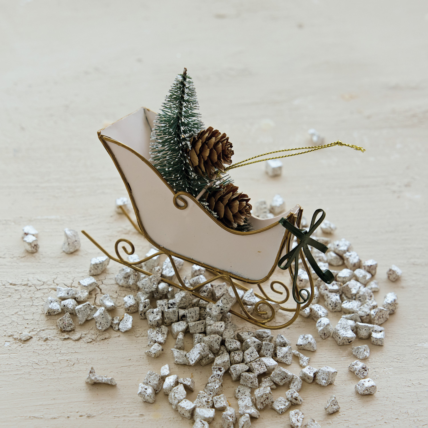 Metal Sleigh Ornament with Bottle Brush Tree & Pinecones