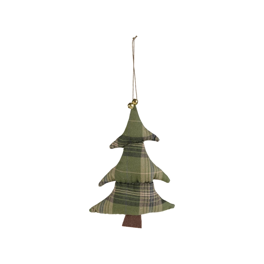 Fabric Tree Ornament with Plaid Pattern & Jingle Bells & Gold Finish