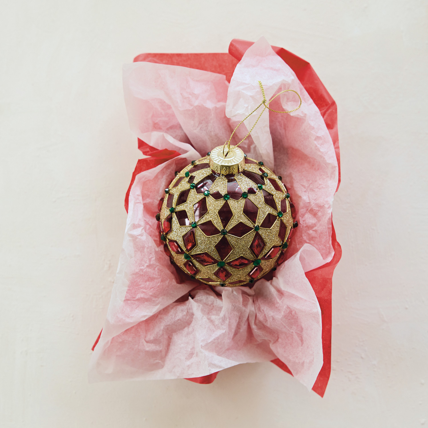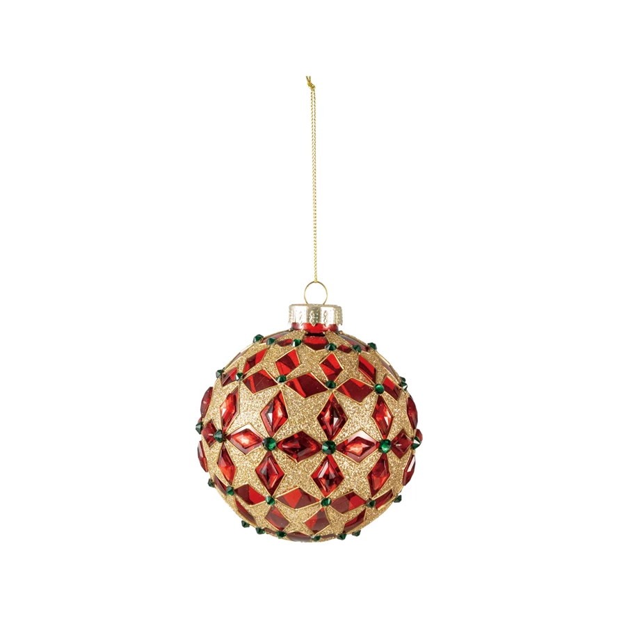 Glass Ball Ornament with Glitter & Jewels, Gold Finish, Red & Green