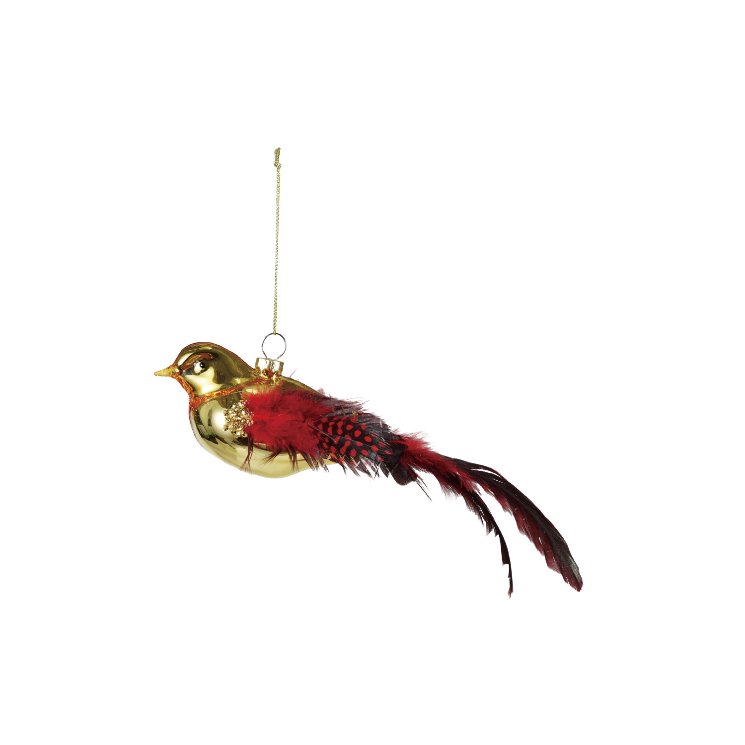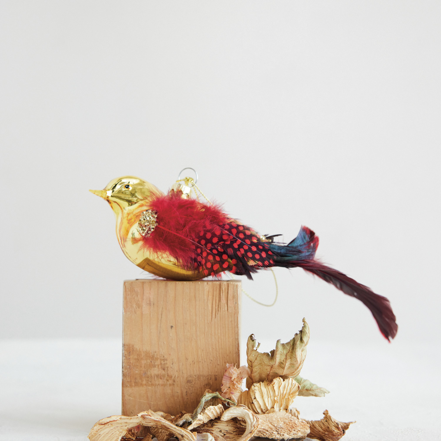 Glass Bird Ornament with Faux Feathers & Glitter, Gold Finish, Red & Black