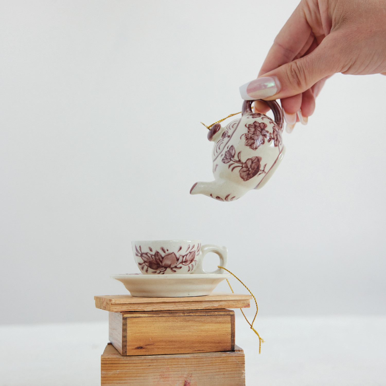 Stoneware Teapot/Teacup Ornament with Botanical Pattern, Burgundy & White, 2 Styles