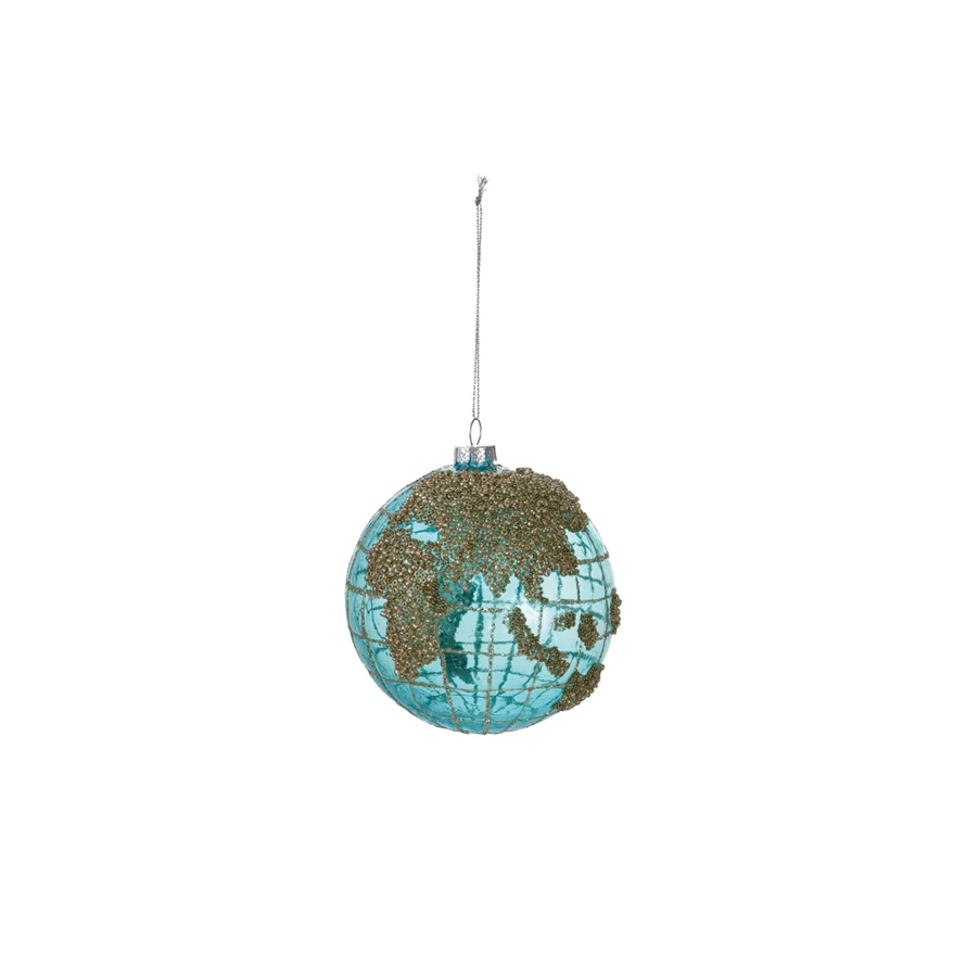 Catalog Name: 4" Round Glass Globe Ornament w/ Beads & Glitter, Blue & Gold Finish