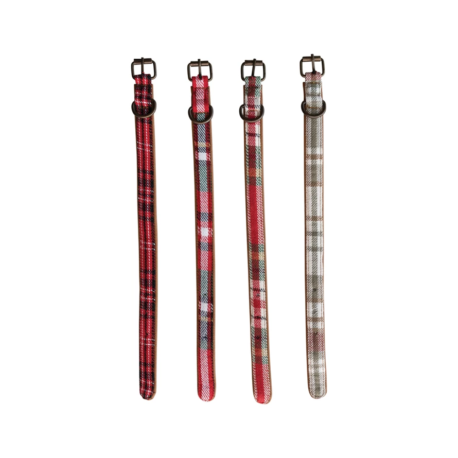 Catalog Name: 19"L x 1"W Cotton Flannel & Leather Dog Collar w/ Tartan Plaid Pattern & Metal Buckle, 4 Styles, Small