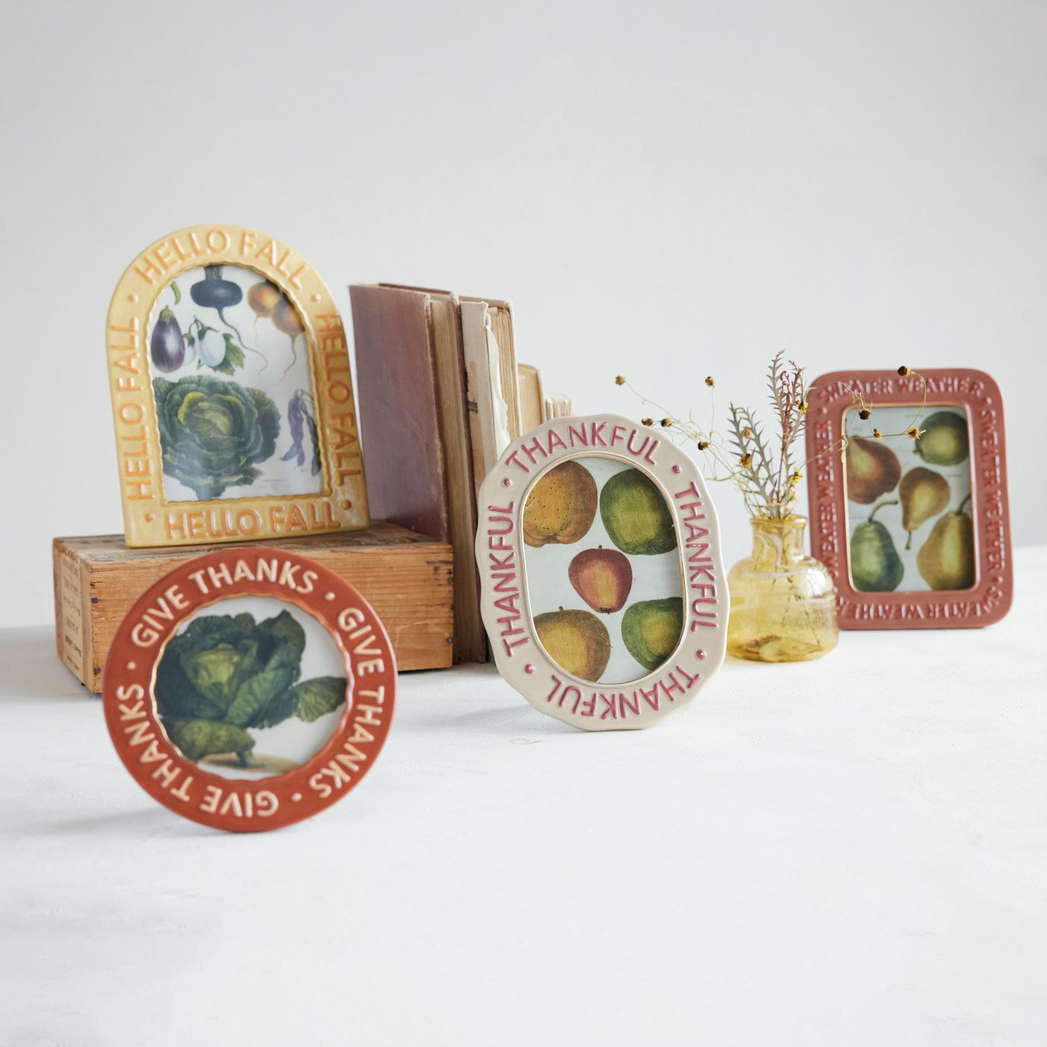 Catalog Name: 6"W x 8"H Hand-Painted Embossed Stoneware Photo Frame "Sweater Weather", Rust Color (Holds 4" x 6" Photo)