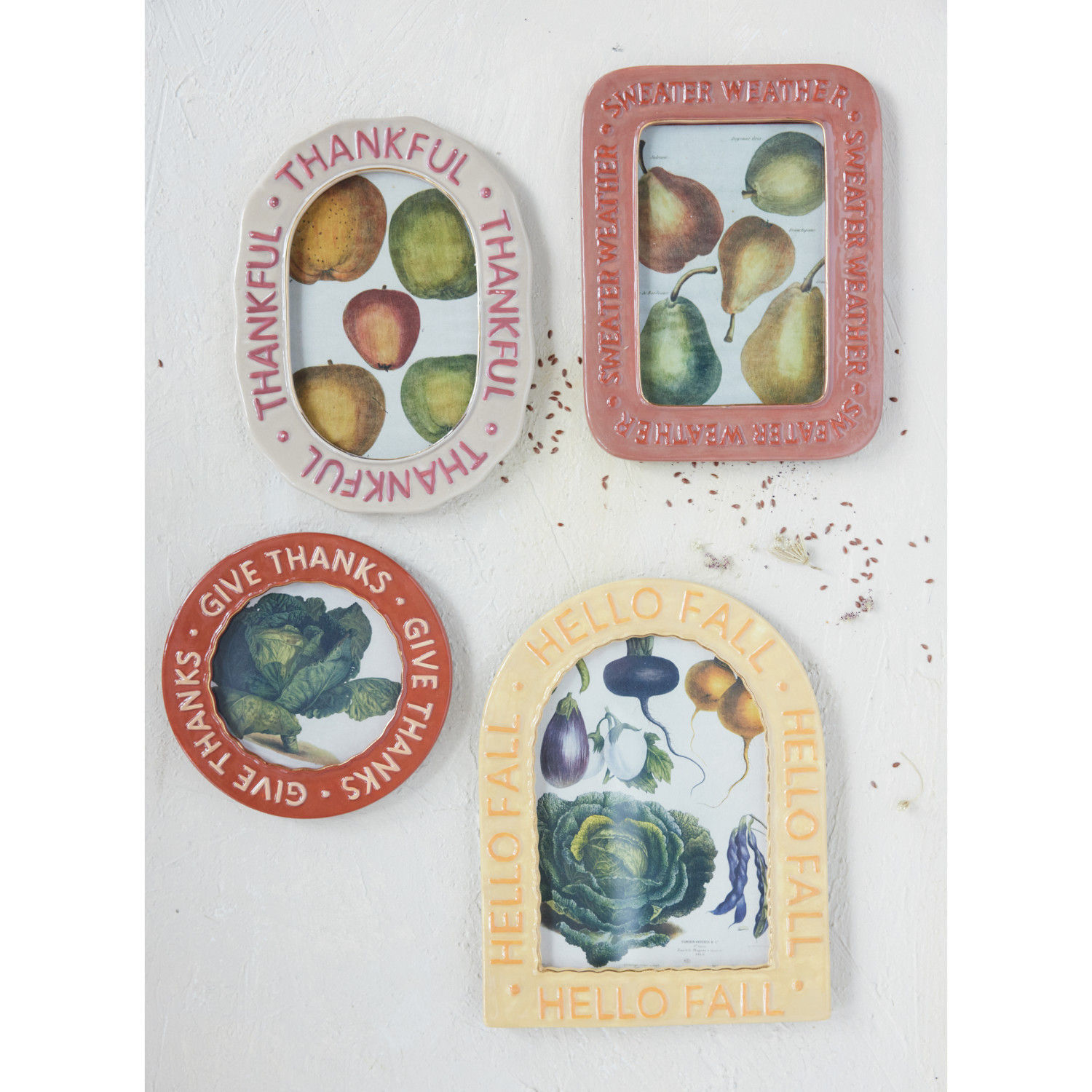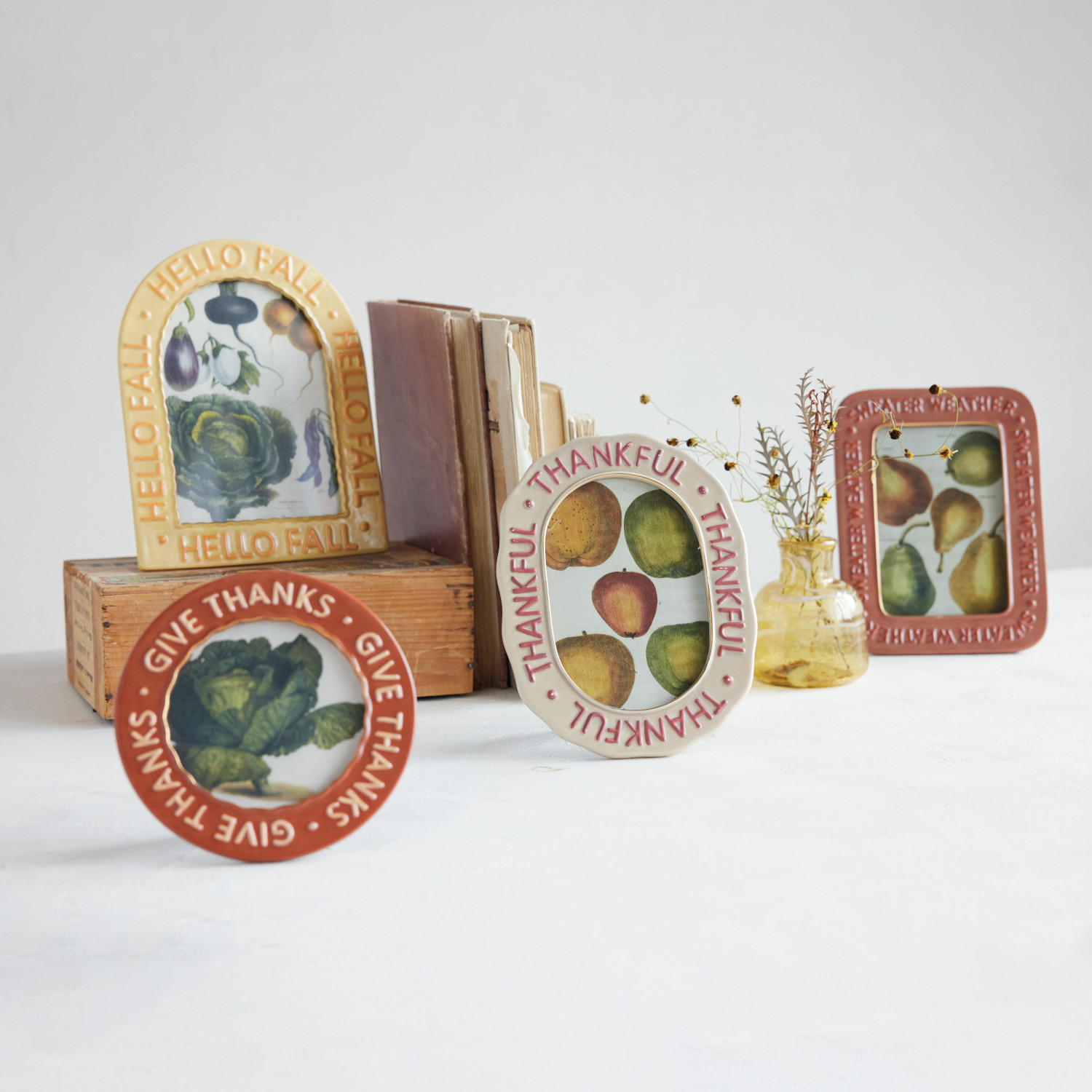 Catalog Name: 6" Round Hand-Painted Embossed Stoneware Photo Frame "Give Thanks", Brown & Beige (Holds 4" x 4" Photo)