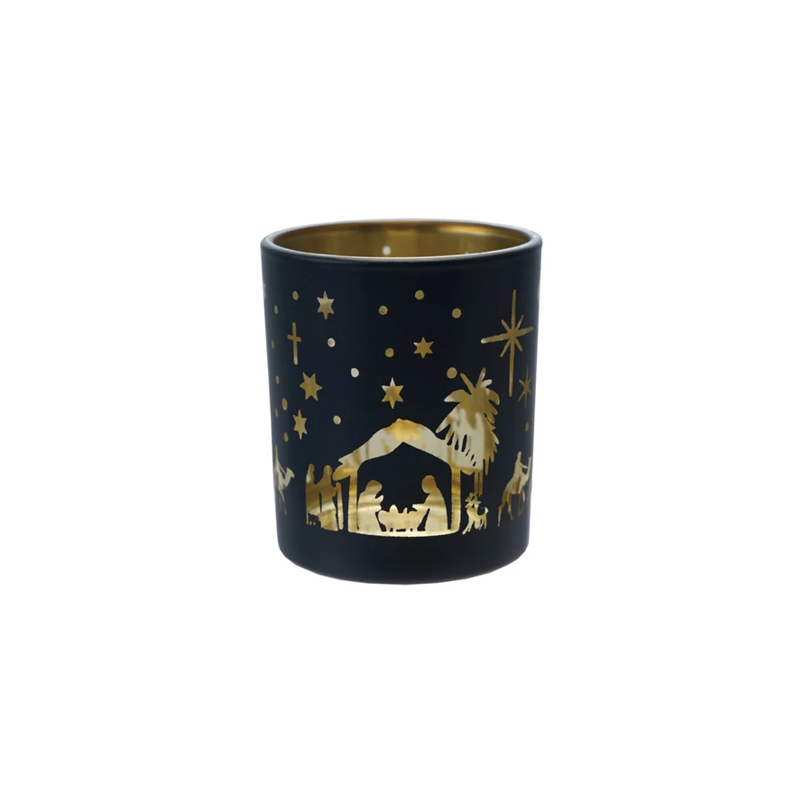 Catalog Name: 2-3/4" Round x 3"H Glass Tealight/Votive Holder w/ Laser Etched Nativity Scene, Matte Navy Color & Gold Finish