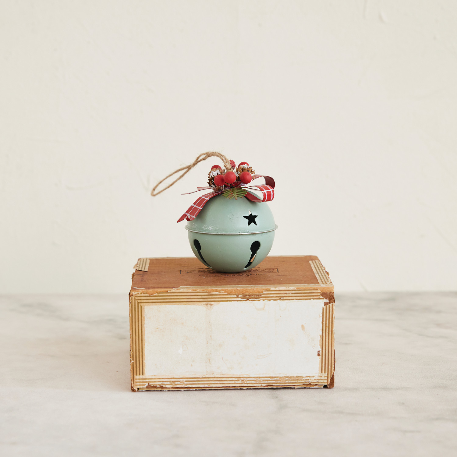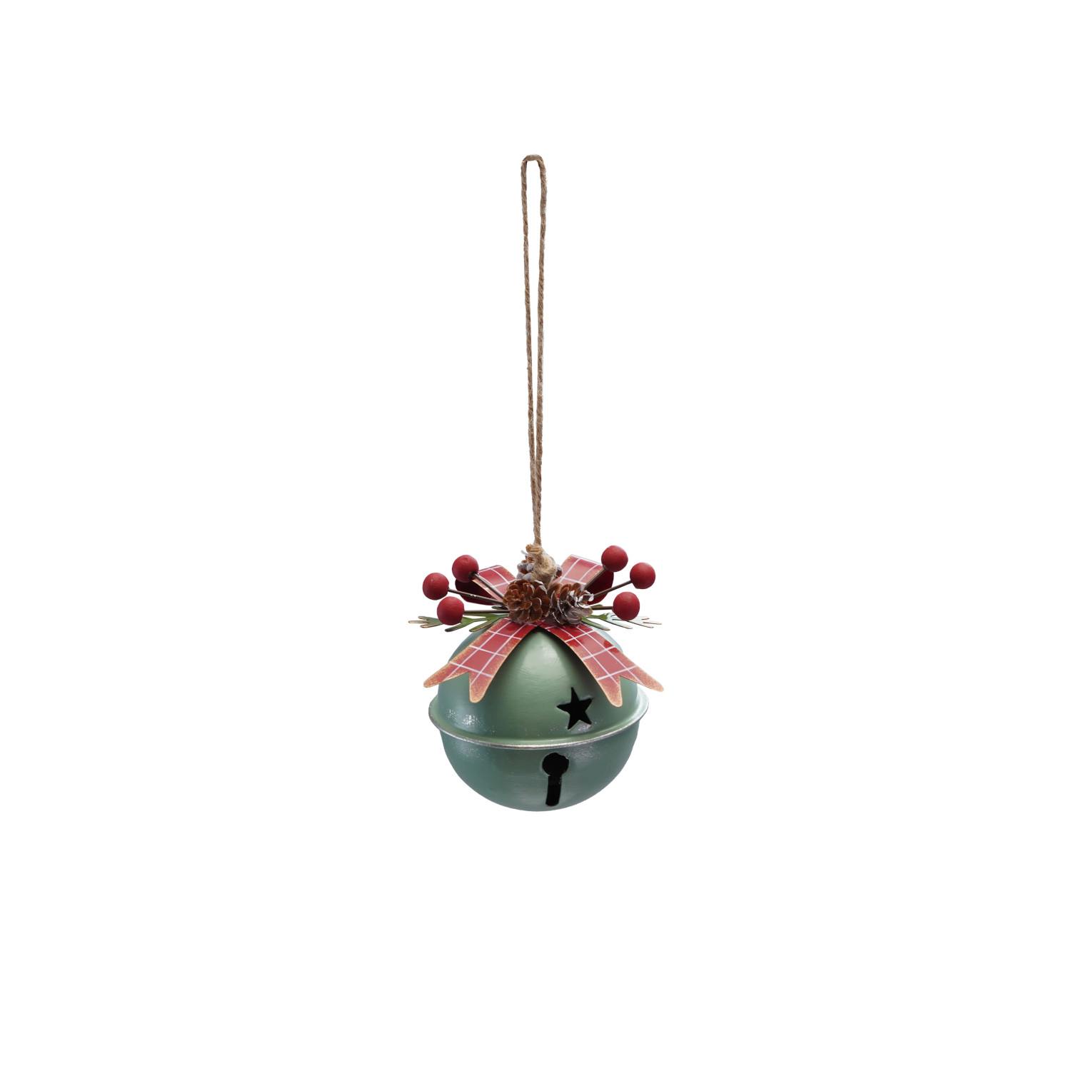 Catalog Name: 3" Round Metal Jingle Bell Ornament w/ Bow, Star Cut-Outs, Pinecones & Holly, Sage Color & Red