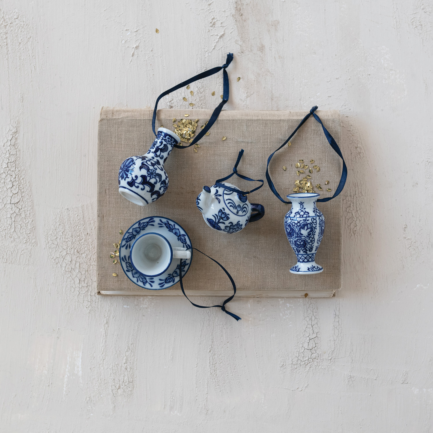 Catalog Name: 1"H - 3"H Stoneware Vase/Teapot/Teacup Ornament w/ Blue Ribbon, Blue & White, 4 Styles