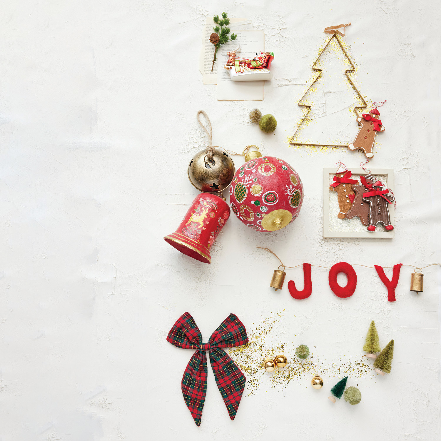 Catalog Name: 3-3/4" Round x 4-1/4"H Hand-Painted Metal Bell Ornament w/ Botanical Design, Red & Gold Finish