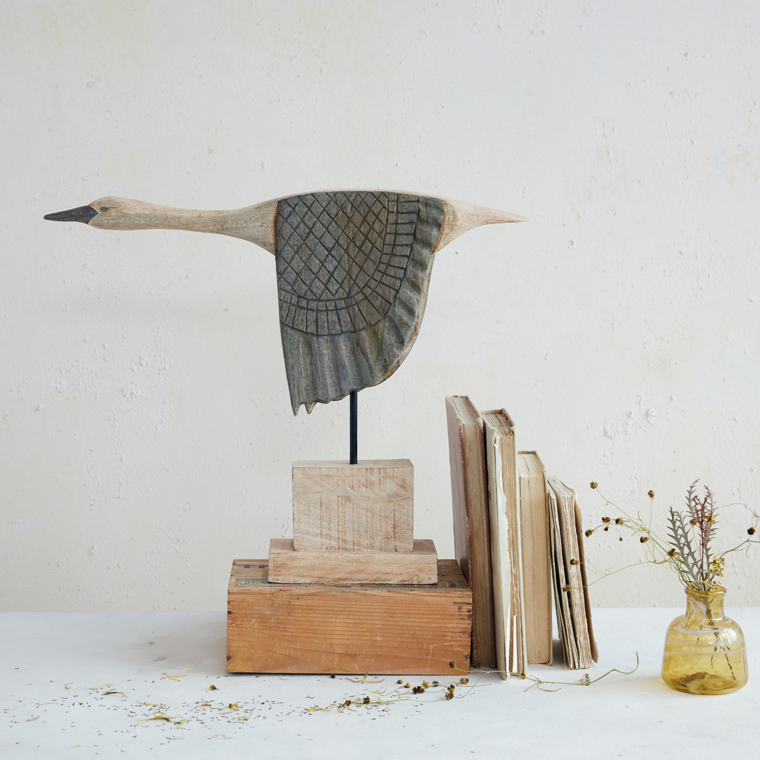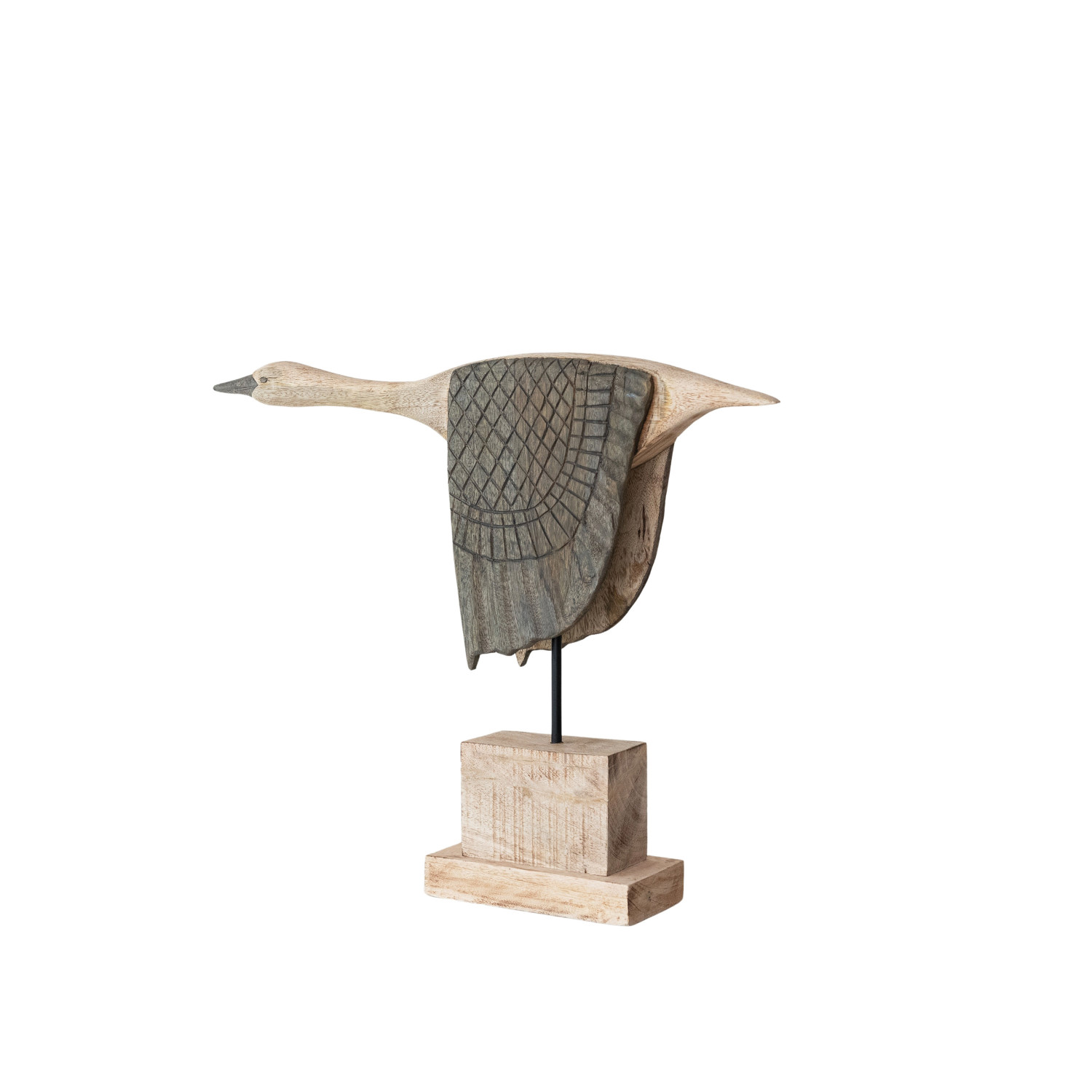 Hand-Carved Mango Wood & Metal Goose on Stand, Natural & Bleached