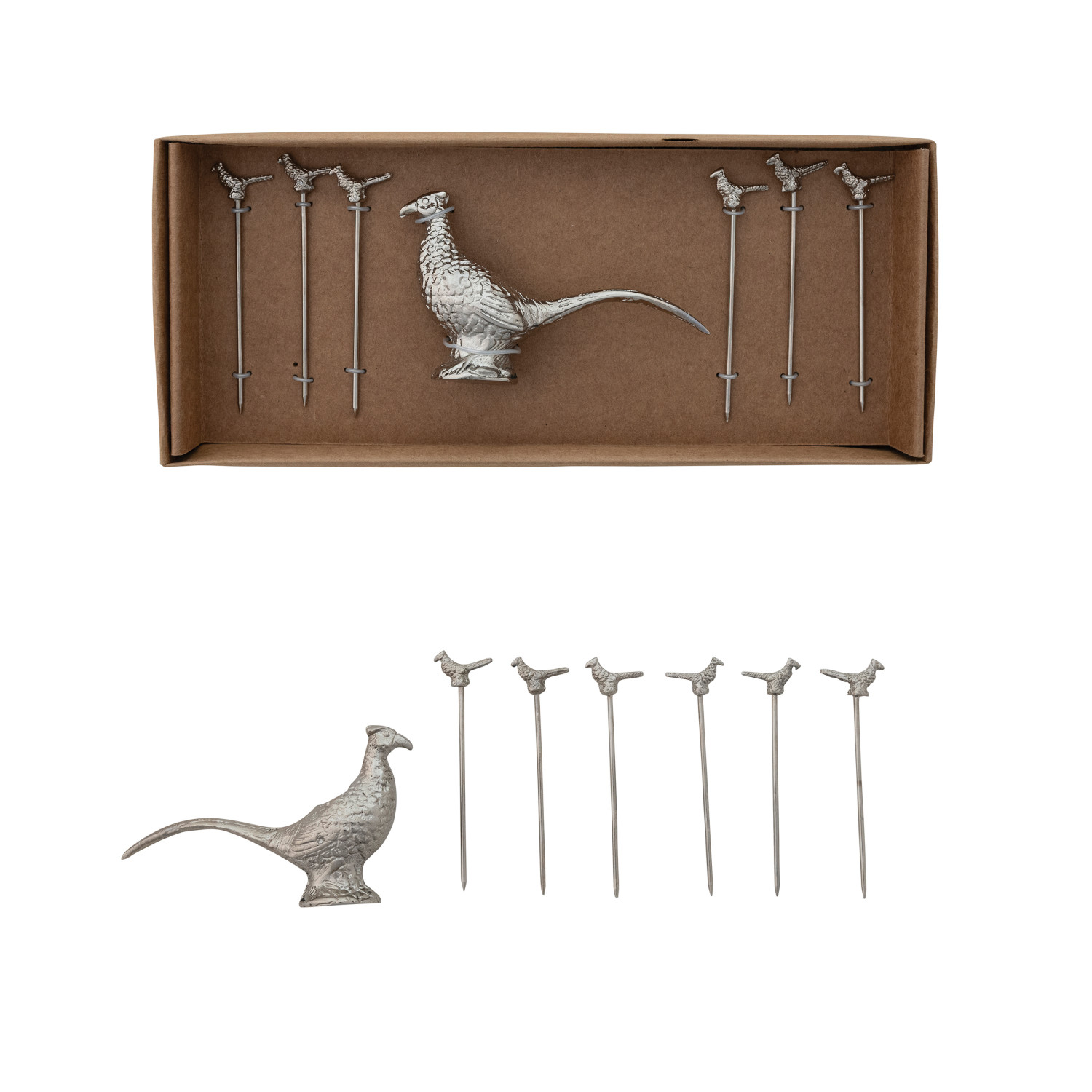 Pheasant Shaped Holder with (6) Stainless Steel Appetizer Picks, Set of 7 in Box